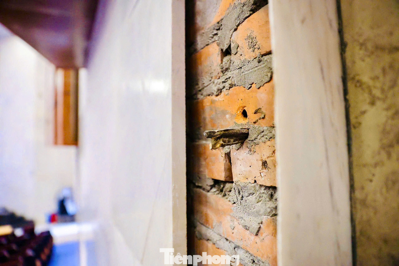 Đặc biệt, hội trường 700 là nơi được tổ chức nhiều sự kiện của trường, của Sở GD&ĐT Hà Nội nhưng ngày 19/10 vừa qua đã xảy ra sự cố rất nguy hiểm. Một viên gạch ốp tường nặng 22 kg ở vị trí gần mái rơi xuống, cắm thẳng vào mặt ghế ngồi rách toác. Tường ốp gạch men cũng được dính keo sơ sài, bảo vệ trường dùng tay gỡ ra từng viên một cách dễ dàng.