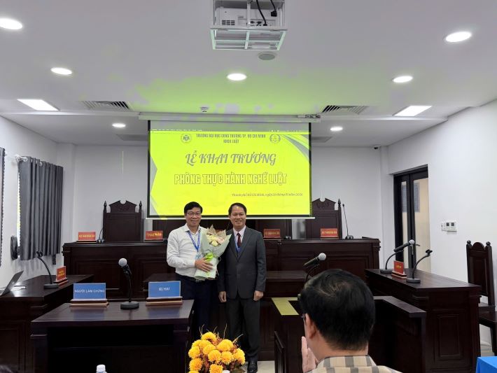 Ngay sau phát biểu khai mạc, Hiệu trưởng Nhà trường và TS. Lương Khải Ân – Trưởng Khoa Luật đã thực hiện nghi thức khánh thành Phòng thực hành nghề Luật, chính thức đưa không gian học tập này vào hoạt động.