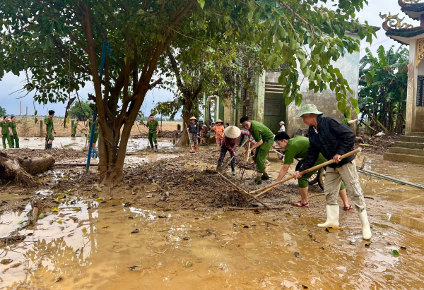CBCS Trường Đại học CSND hối hợp cùng Công an xã Vu Gia tham gia dọn dẹp bùn đất, vệ sinh môi trường khu vực công cộng, giúp bà con khắc phục những hậu quả do lũ để lại.