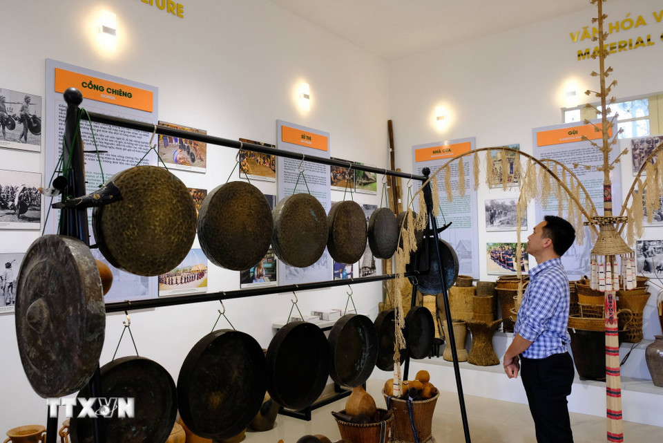 Du khách tham quan không gian trưng bày văn hóa các dân tộc Tây Nguyên tại trường Đại học Đà Lạt. (Ảnh: Nguyễn Dũng/TTXVN)