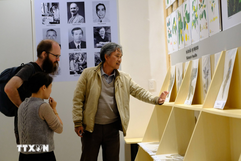 Tiến sỹ Lương Văn Dũng (trường Đại học Đà Lạt) giới thiệu với du khách thông tin về các loại trà mi của Việt Nam. (Ảnh: Nguyễn Dũng/TTXVN)