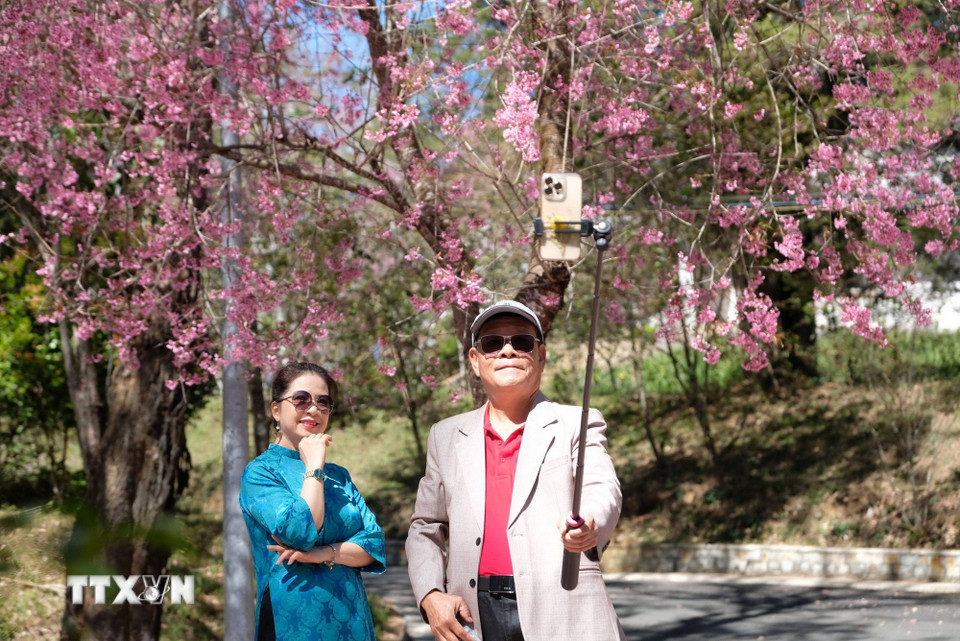 Du khách chụp hình check-in với hoa mai anh đào nở rộ trong khuôn viên trường Đại học Đà Lạt. (Ảnh: Nguyễn Dũng/TTXVN)