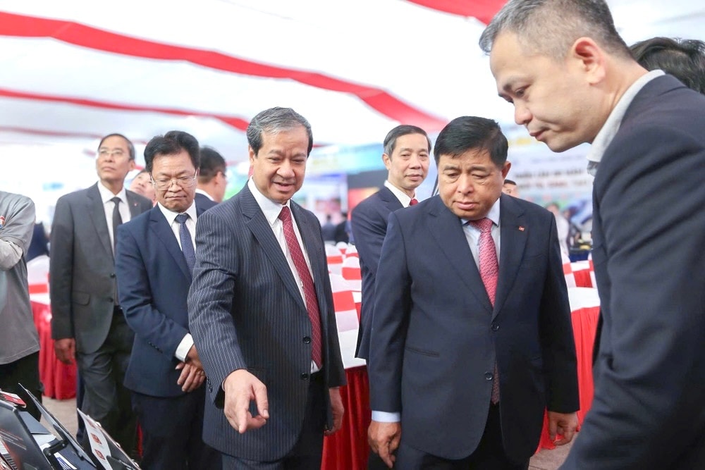 Phó Thủ tướng Nguyễn Chí Dũng, Bộ trưởng Bộ Giáo dục và Đào tạo Nguyễn Kim Sơn cùng các đại biểu tham quan triển lãm khoa học và công nghệ. Ảnh: CTV