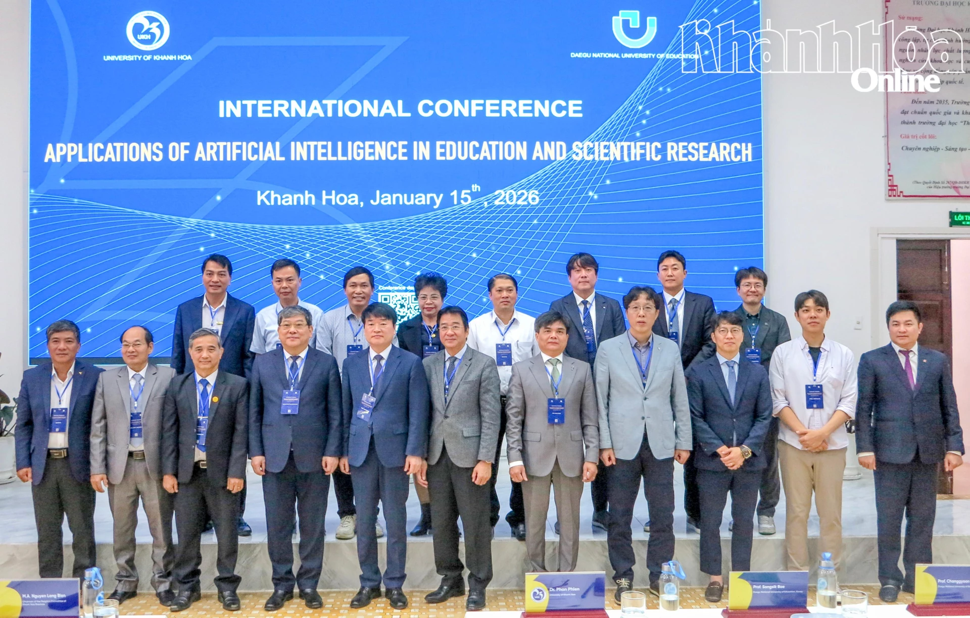 Các đại biểu chụp ảnh lưu niệm tại Hội thảo khoa học quốc tế “Ứng dụng AI trong đào tạo và nghiên cứu khoa học” do Trường Đại học Khánh Hòa phối hợp tổ chức.