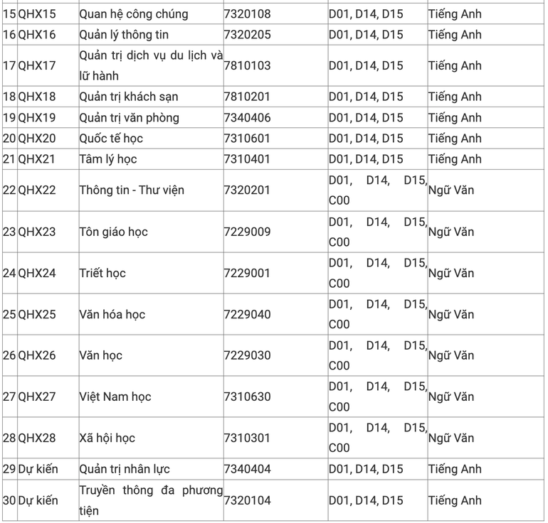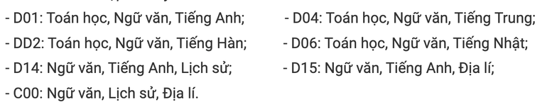 Trường bỏ một số tổ hợp như D66 hoặc X78 (Toán, Văn, Giáo dục công dân/Giáo dục kinh tế và pháp luật), C03 (Toán, Văn, Sử), C04 (Toán, Văn, Địa). Tổ hợp C00 (Văn, Sử, Địa) cũng chỉ sử dụng đối với 15/30 ngành.
