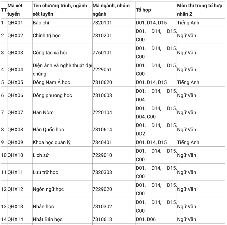 Tổ hợp xét tuyển dự kiến năm 2026 của USSH