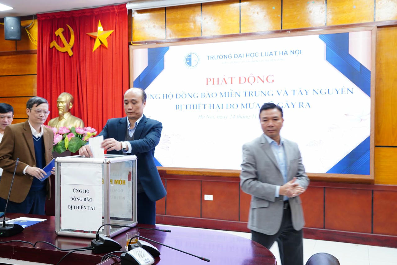 Phát biểu tại Lễ phát động, PGS.TS Tô Văn Hòa, Hiệu trưởng Trường Đại học Luật Hà Nội nhấn mạnh, những thiệt hại nghiêm trọng do mưa lũ tại khu vực miền Trung và Tây Nguyên trong thời gian qua đã và đang ảnh hưởng nặng nề đến đời sống của người dân. Trước tình hình đó, với tinh thần trách nhiệm và truyền thống tương thân, tương ái, Trường Đại học Luật Hà Nội tổ chức Lễ phát động nhằm kêu gọi sự chung tay, sẻ chia của toàn thể viên chức, người lao động, học viên và sinh viên Nhà trường đối với đồng bào vùng thiên tai.
