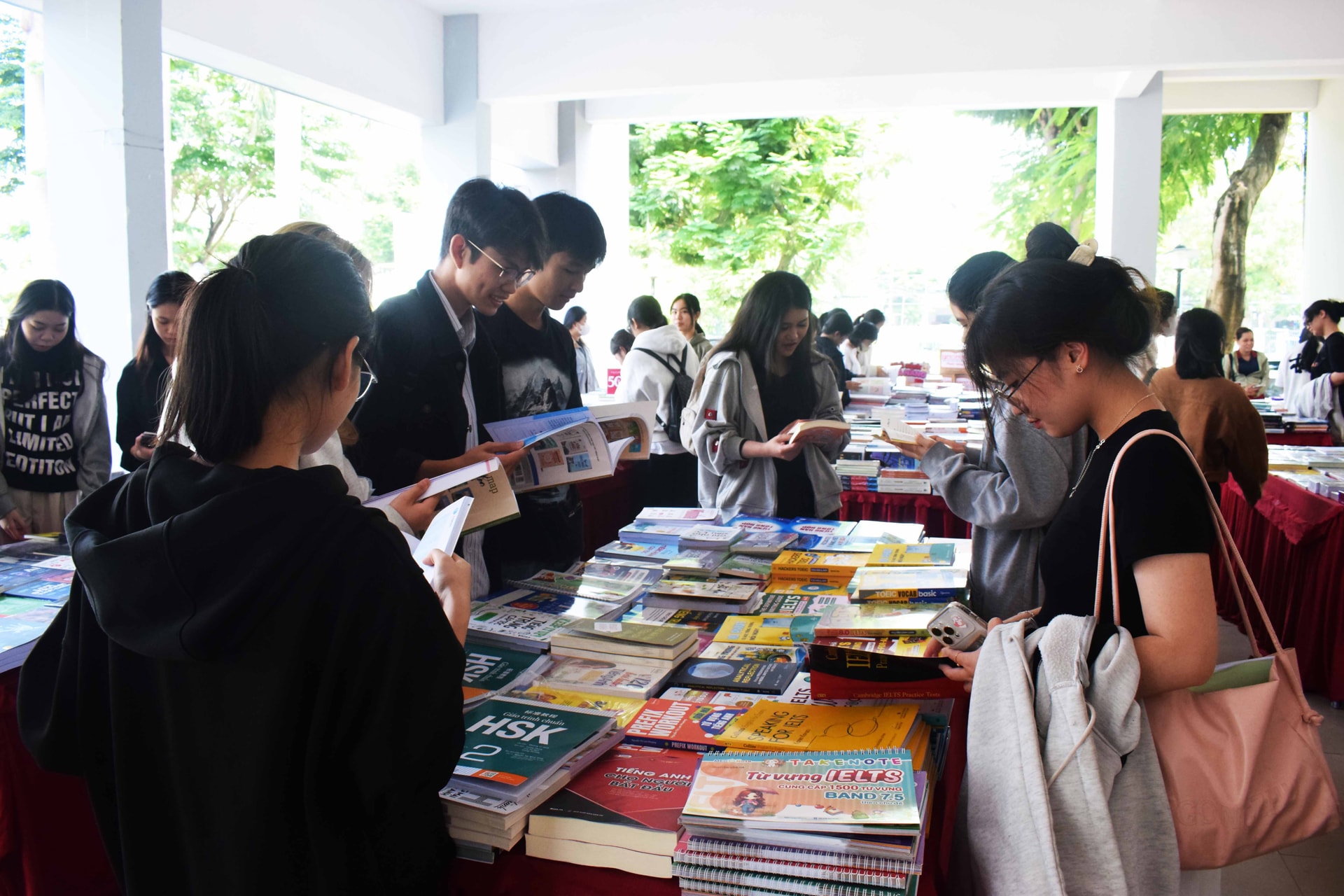 Đông đảo sinh viên tham gia không gian triển lãm, trưng bày và giới thiệu sách tại khuôn viên nhà trường. Ảnh: ĐOÀN HẠO LƯƠNG