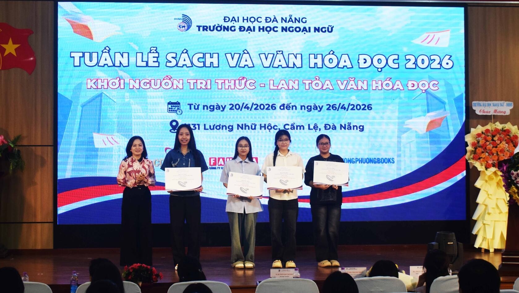 TS. Huỳnh Ngọc Mai Kha, Phó Hiệu trưởng Trường Đại học Ngoại ngữ (bên trái) trao giải Cuộc thi thiết kế video clip “Đọc sách cùng Gen Z”. Ảnh: ĐOÀN HẠO LƯƠNG