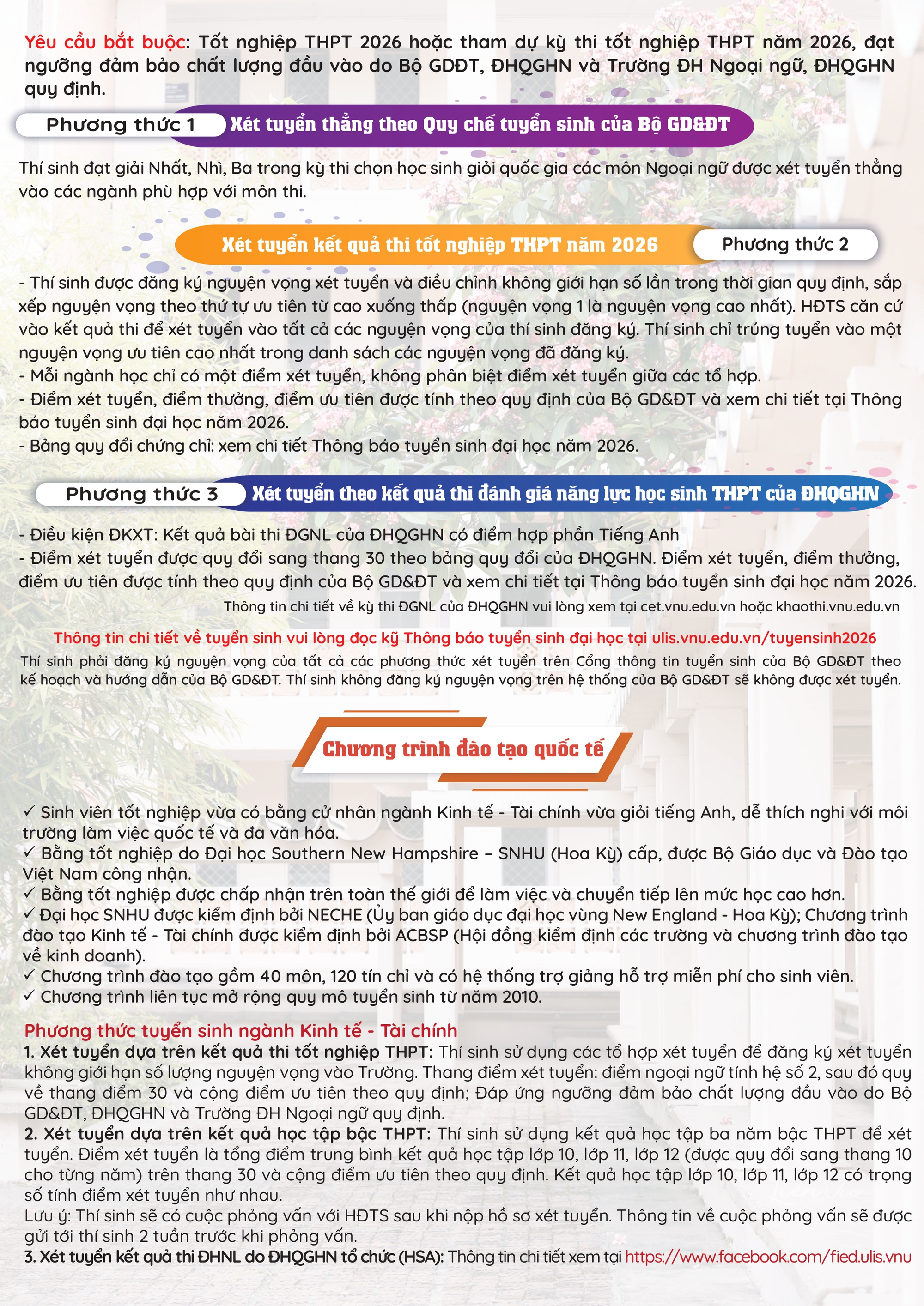 Trường Đại học Ngoại ngữ - Đại học Quốc gia Hà Nội dự kiến thông tin tuyển sinh 2026 hệ đại học chính quy với nhiều điểm nổi bật như phương thức xét tuyển, chương trình đào tạo, chỉ tiêu.