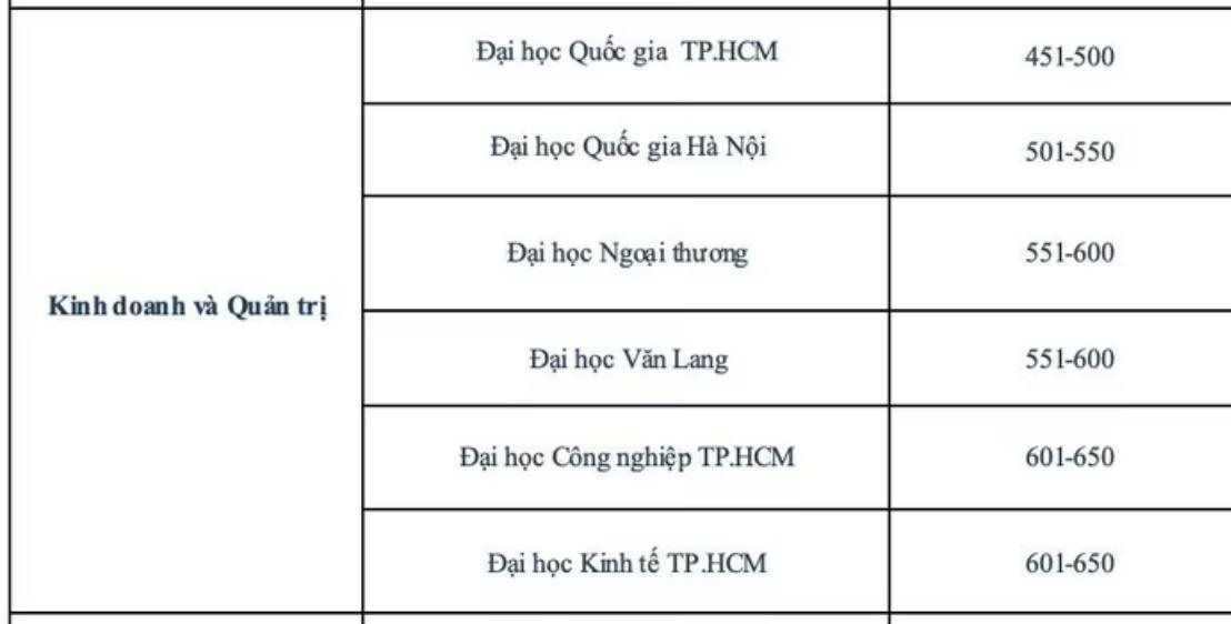 Trong đó, 4 trường lần đầu được QS xếp hạng theo ngành là: Đại học Công nghiệp TP.HCM, Đại học Anh Quốc Việt Nam (BUV), Học viện Nông nghiệp Việt Nam và Đại học Ngoại thương, chủ yếu ở các ngành thế mạnh.