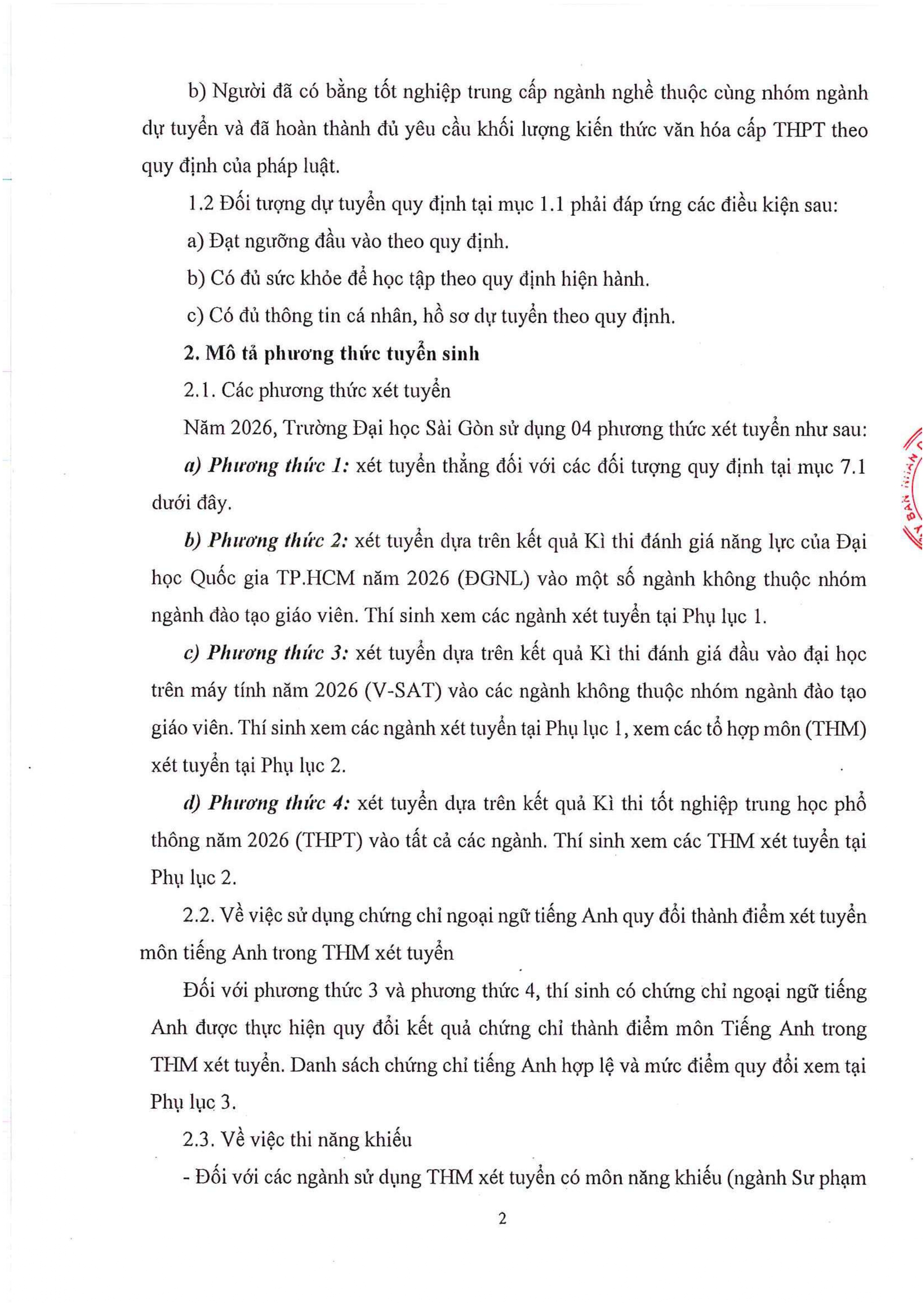 Năm 2026, Trường Đại học Sài Gòn sử dụng 04 phương thức xét tuyển như sau: