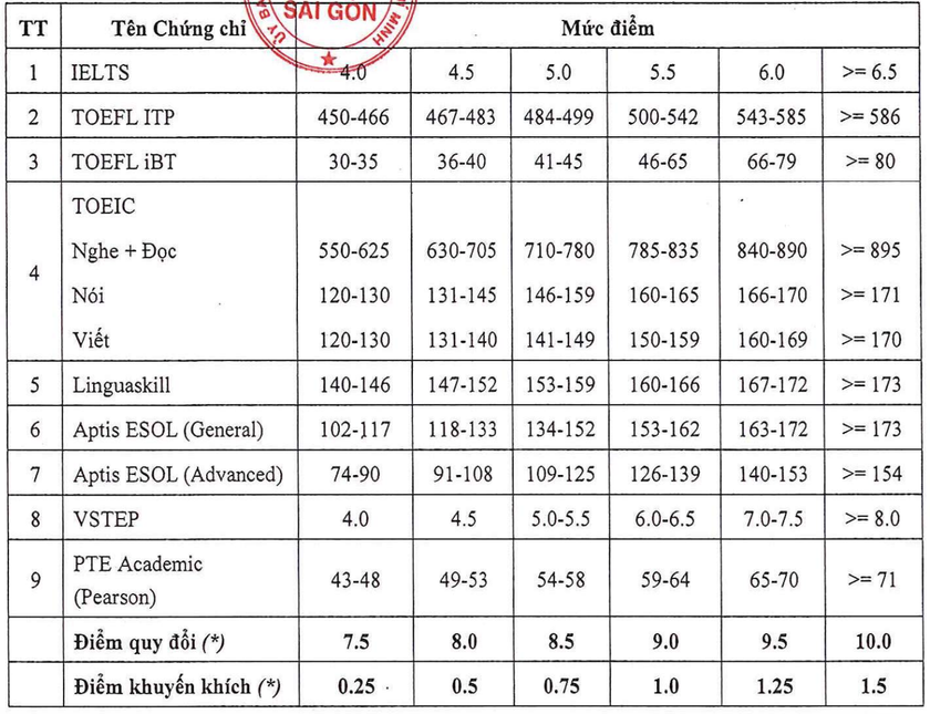 Danh sách chứng chỉ Tiếng Anh hợp lệ và mức điểm quy đổi: