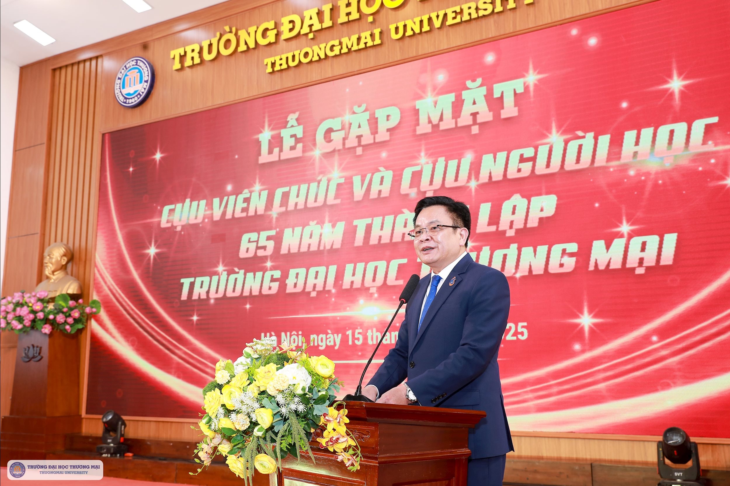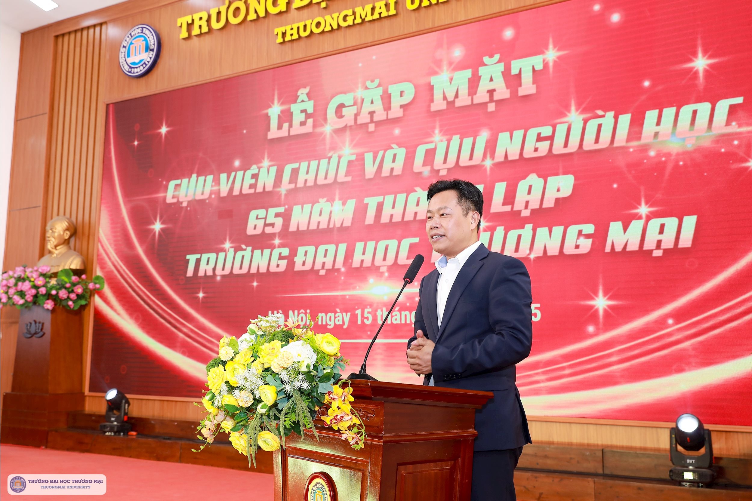 Phát biểu tại buổi lễ, PGS.TS Nguyễn Hoàng, Hiệu trưởng Trường Đại học Thương mại (TMU) đã bày tỏ lòng tri ân tới những thế hệ cán bộ, giảng viên, sinh viên của nhà trường trong 65 năm qua.