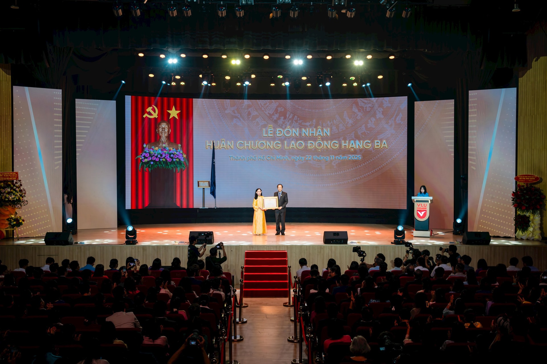 Phó Chủ tịch UBND thành phố Hồ Chí Minh Nguyễn Mạnh Cường thay mặt lãnh đạo Đảng, Nhà nước trao tặng Huân chương Lao động hạng Nhì cho VLU. Ảnh: Nghiêm Ý.