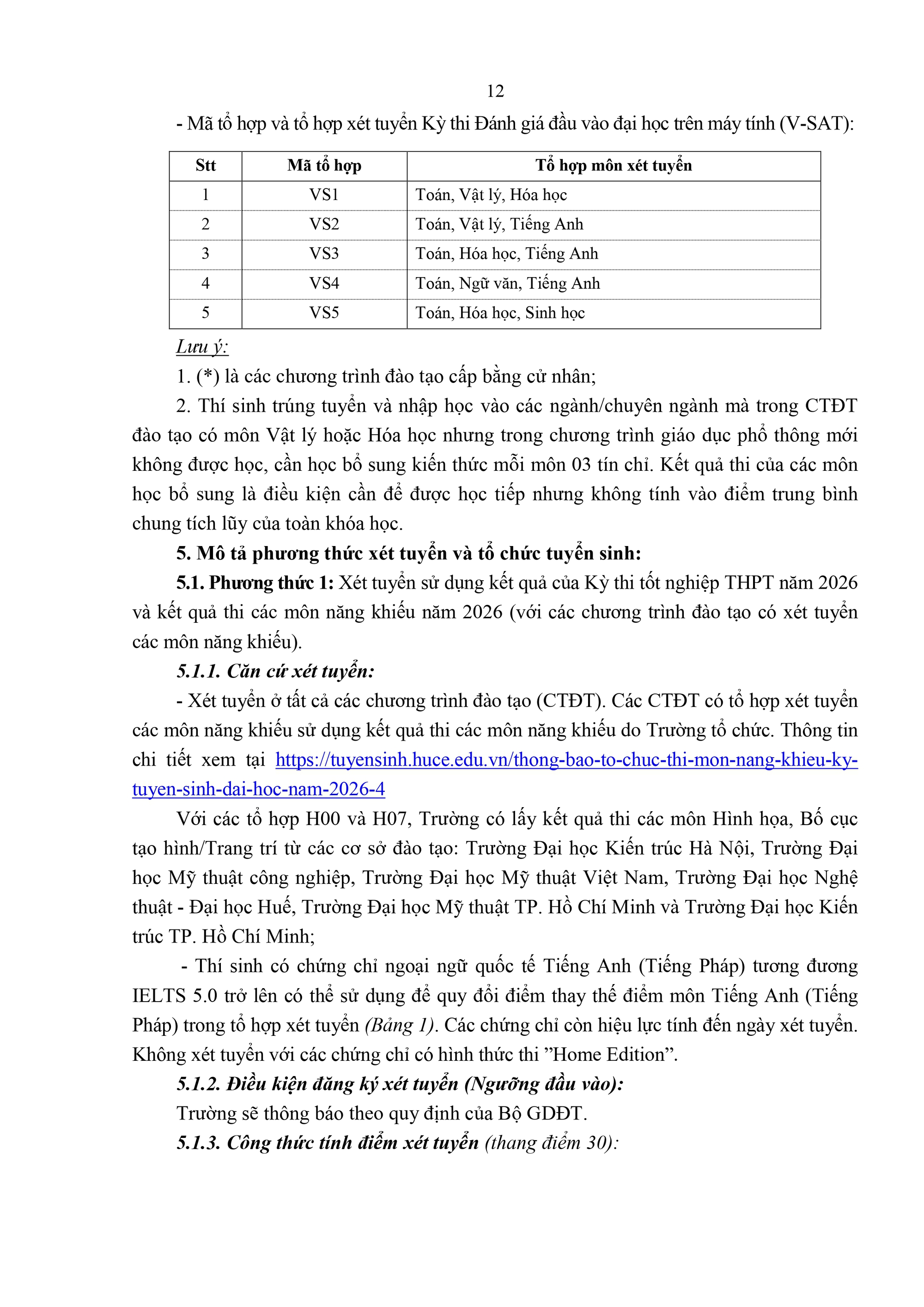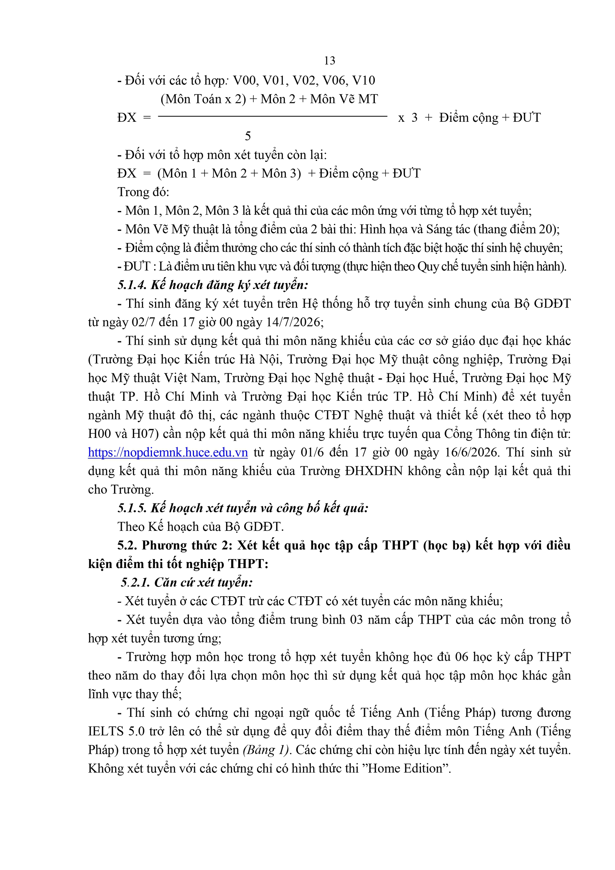 - Thí sinh sử dụng kết quả thi môn năng khiếu của các cơ sở giáo dục đại học khác, cần nộp kết quả thi môn năng khiếu trực tuyến qua Cổng Thông tin điện tử: https://nopdiemnk.huce.edu.vn từ ngày 01/6 đến 17 giờ 00 ngày 16/6/2026.