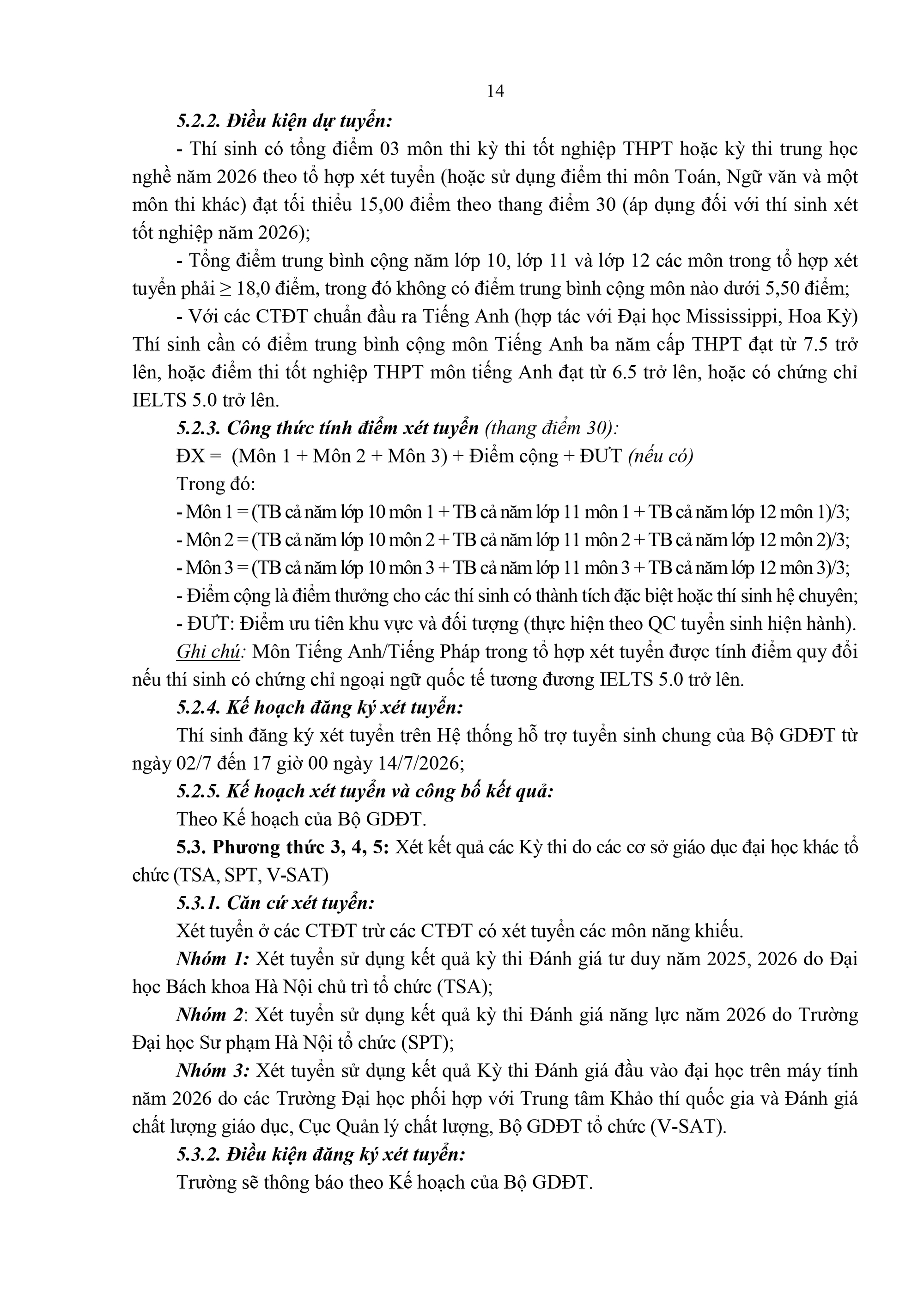 - Thí sinh đăng ký nguyện vọng xét tuyển trên Hệ thống hỗ trợ tuyển sinh chung của Bộ GDĐT (Hệ thống) từ ngày 02/7 đến 17 giờ 00 ngày 14/7/2026.