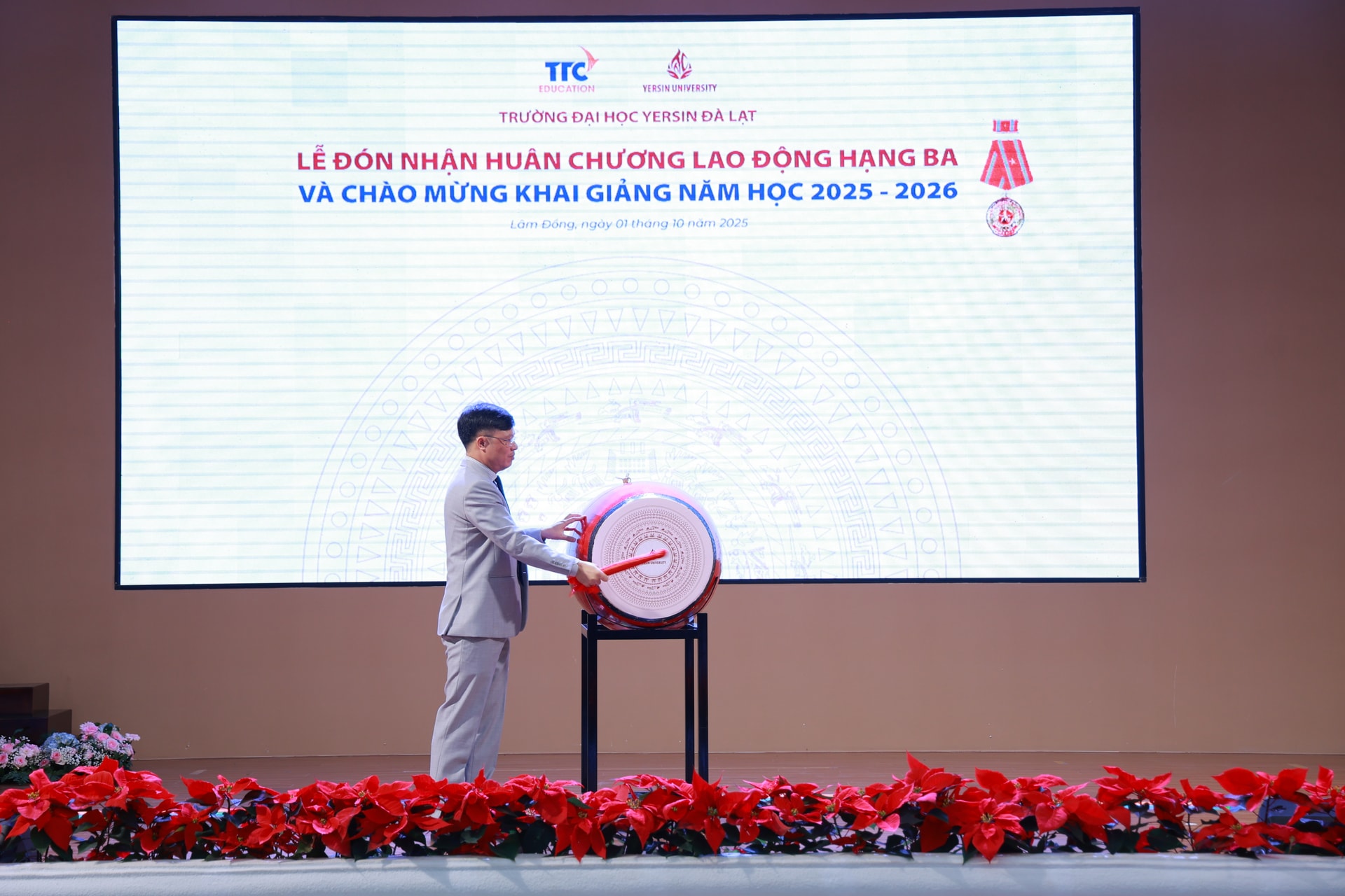 TS. Phạm Đình Trung, Hiệu trưởng Trường Đại học Yersin Đà Lạt đánh trống khai giảng năm học 2025-2026