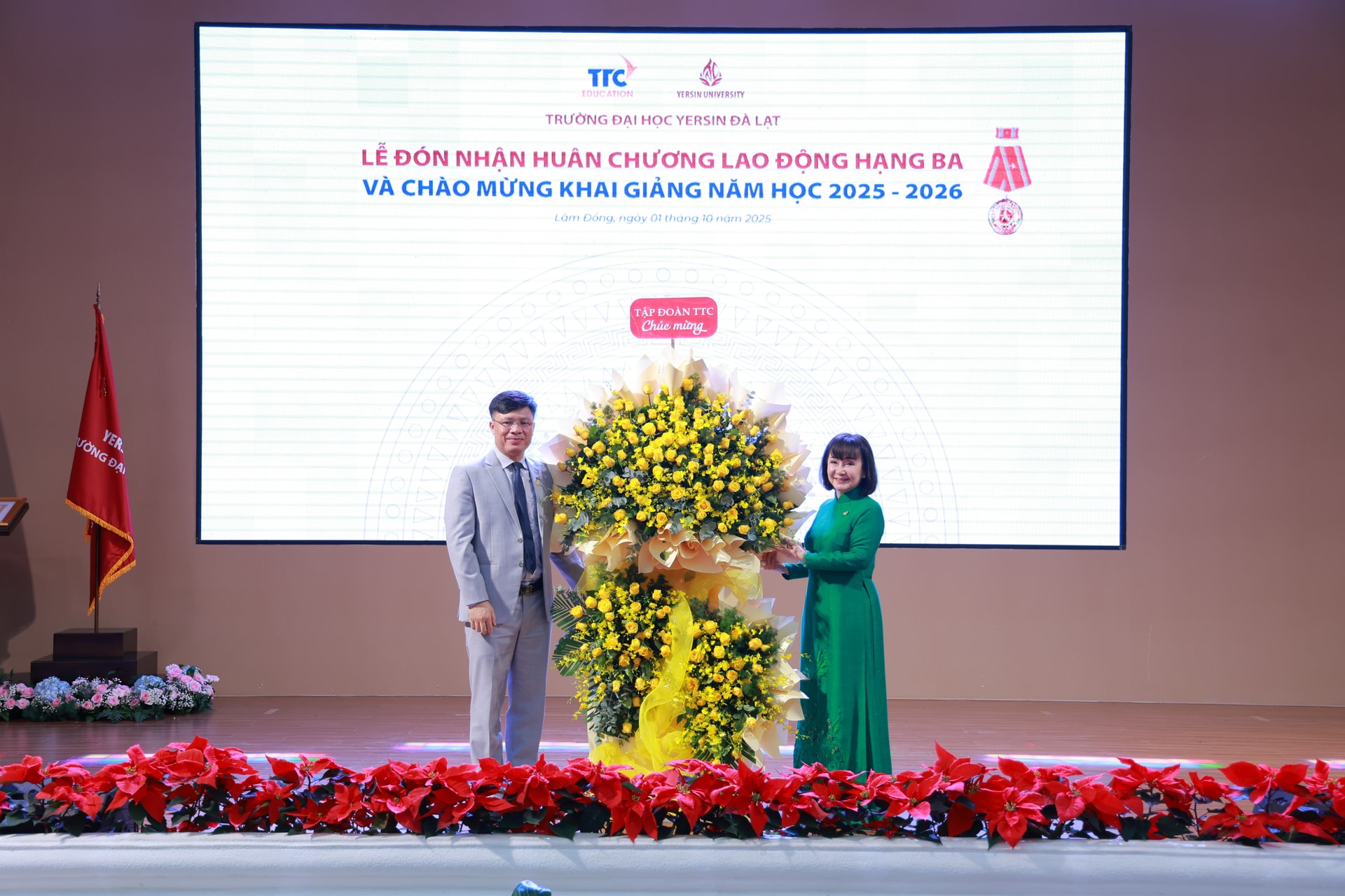 Lãnh đạo tỉnh Lâm Đồng tặng hoa chúc mừng nhà trường đón nhận Huân chương Lao động hạng Ba và khai giảng năm học 2025 - 2026