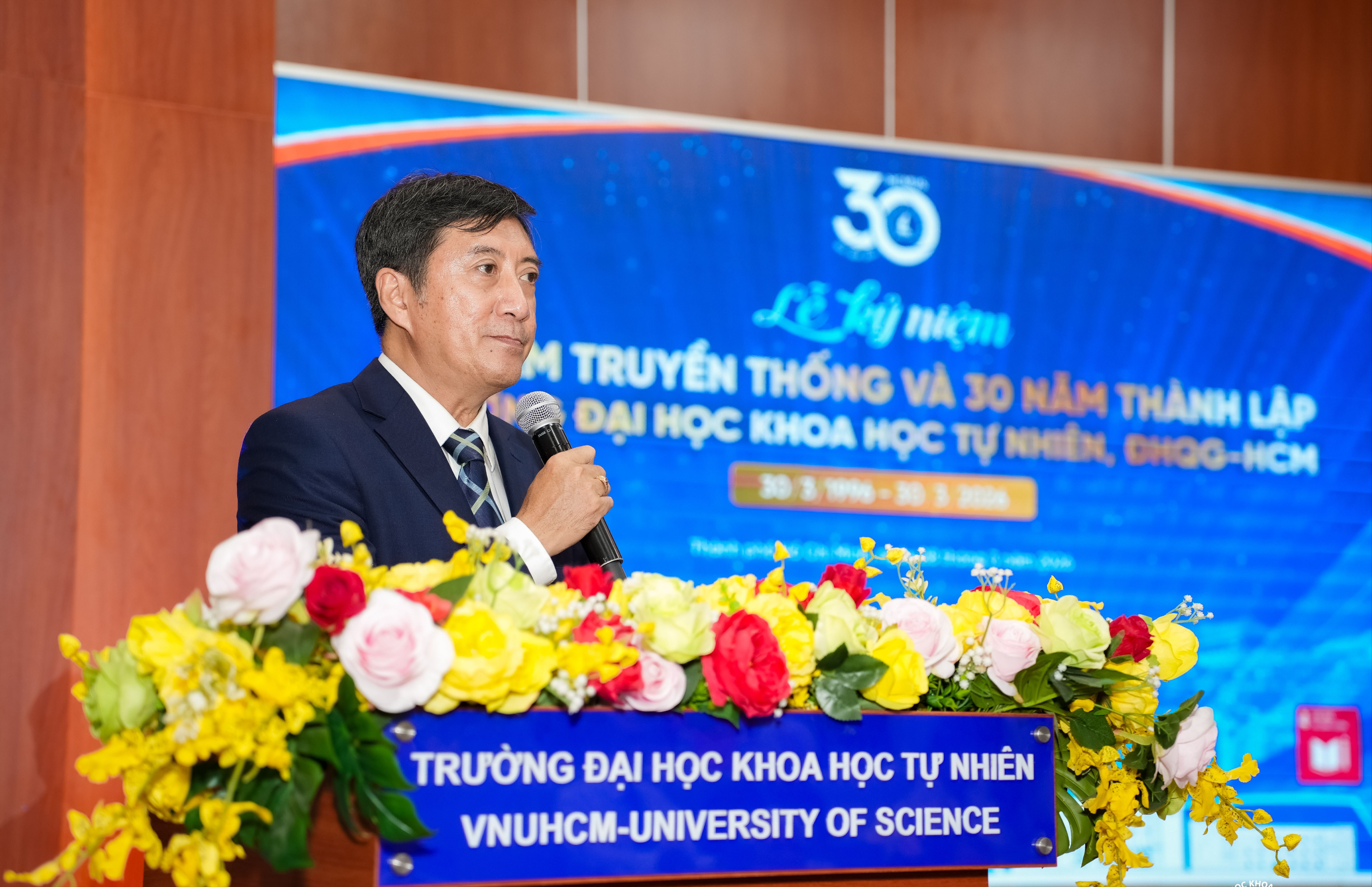 Phát biểu tại buổi lễ, PGS-TS Trần Lê Quan, Hiệu trưởng trường Đại học Khoa học tự nhiên, cho biết, trải qua nhiều lần đổi tên và tái cấu trúc, trường đã khẳng định vai trò quan trọng trong đào tạo và nghiên cứu khoa học cơ bản. Trong xu hướng phát triển mới, trường mở rộng đào tạo các lĩnh vực liên ngành và công nghệ hiện đại như trí tuệ nhân tạo, khoa học dữ liệu, công nghệ bán dẫn…