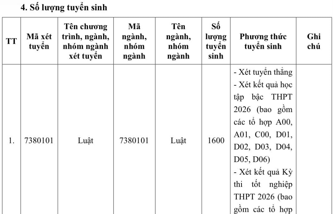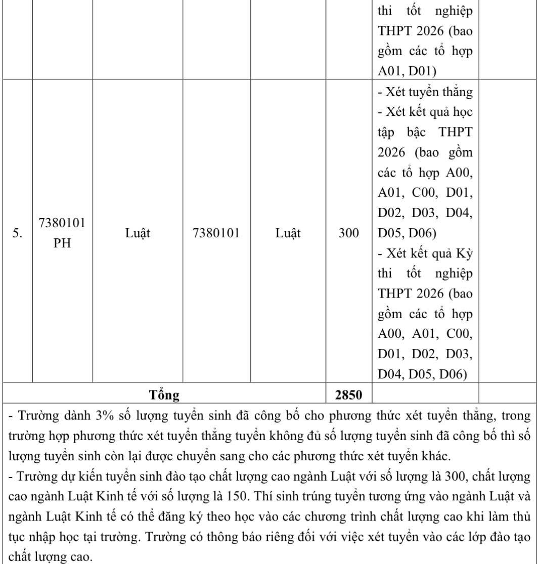 Năm 2026, Trường Đại học Luật Hà Nội tuyển sinh đại học chính quy theo các phương thức sau đây: