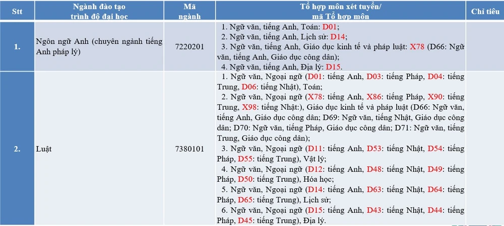 Với ngành luật, Trường dự kiến bỏ hàng loạt tổ hợp như A00, A01, C00, X01, X25, X33, X45; đồng thời bổ sung nhiều tổ hợp mới, gồm các tổ hợp có môn ngữ văn kết hợp ngoại ngữ với vật lý, hóa học, lịch sử, địa lý và giáo dục kinh tế và pháp luật, như D04, D11, D12, D14, D15, D43, D44, D45, D48, D49, D50, D53, D54, D55, D63, D64, D65 và X90.