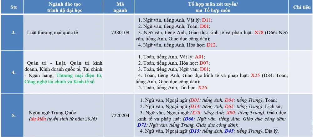 Đối với ngành luật thương mại quốc tế, Trường dự kiến bỏ các tổ hợp A01, X01, X25 và bổ sung các tổ hợp D11, D12. Trong khi đó, các ngành quản trị – luật, quản trị kinh doanh, kinh doanh quốc tế và tài chính – ngân hàng dự kiến không còn sử dụng tổ hợp A00 và X01, đồng thời bổ sung tổ hợp mới X26.