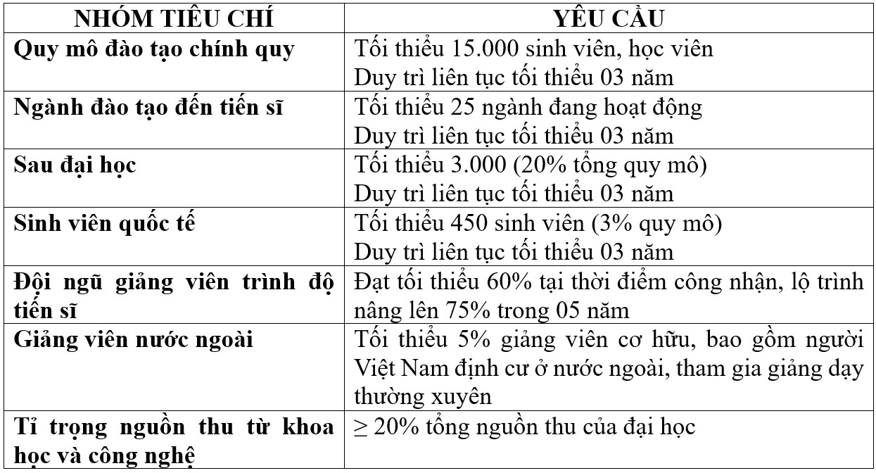 Bên cạnh đó, các tiêu chí cũng ngày càng nâng cao, như tỷ lệ giảng viên có trình độ tiến sĩ, số lượng công bố khoa học quốc tế, mức độ quốc tế hóa và năng lực tự chủ toàn diện. Đồng thời, cơ sở giáo dục phải đảm bảo minh bạch, kiểm định chất lượng và trách nhiệm giải trình trong hoạt động đào tạo, nghiên cứu.