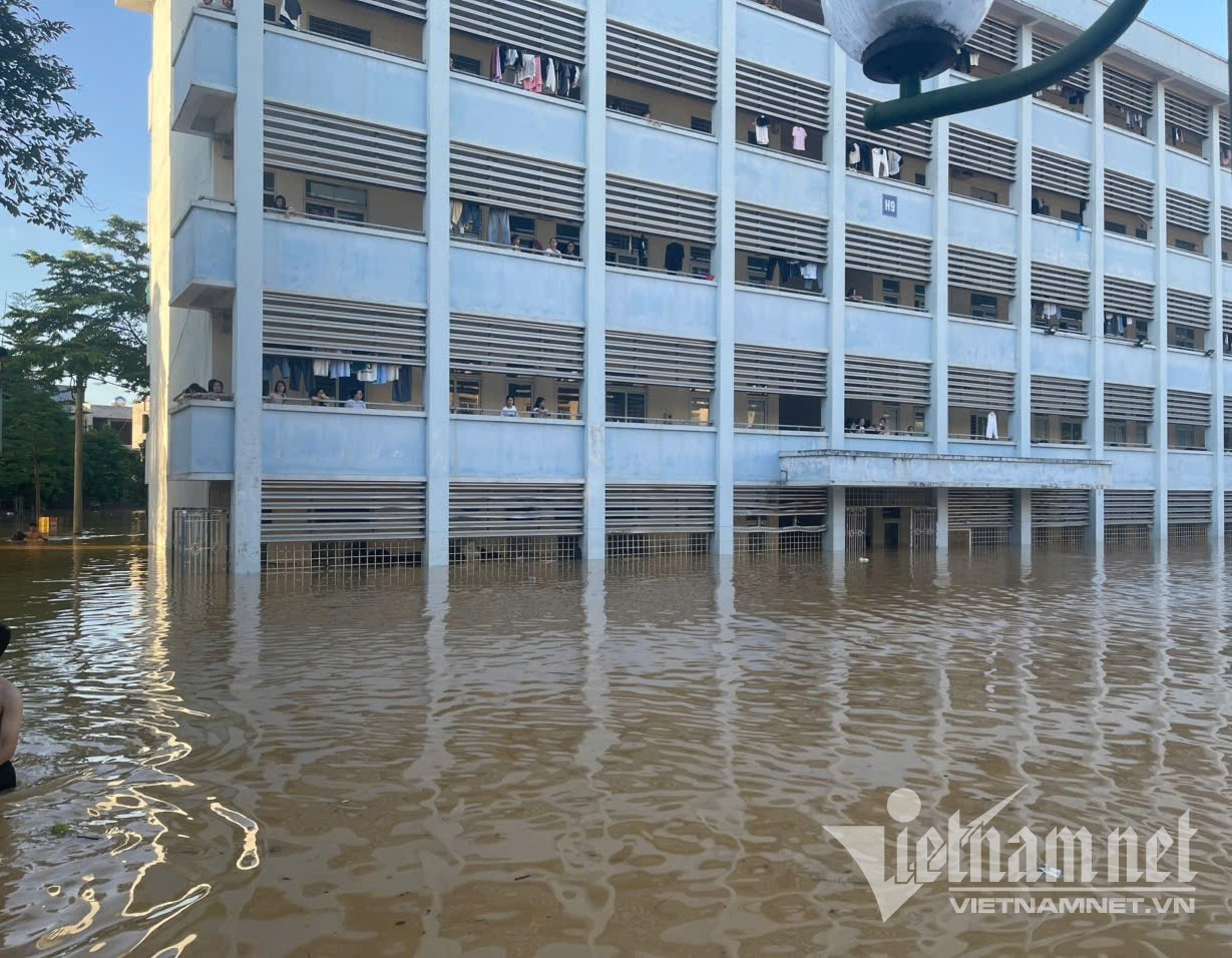 Vị này cho hay, trước đó, khi nước ngập lên, nhà trường đã thông báo với các sinh viên ở tầng 1 di chuyển lên tầng 2,3,4,5 ở ghép tạm cùng các bạn.