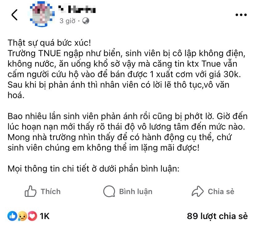 “Trường TNUE ngập như biển, sinh viên bị cô lập không điện, không nước, ăn uống khổ sở vậy mà căng tin ký túc xá vẫn cấm người cứu hộ vào để bán 1 suất cơm với giá 30.000 đồng. Sau khi bị phản ánh thì nhân viên có lời lẽ thô tục, vô văn hóa. Bao nhiêu lần sinh viên phản ánh rồi cũng bị phớt lờ”, một tài khoản được cho là sinh viên của Trường Đại học Sư phạm - Đại học Thái Nguyên lên tiếng trên mạng xã hội, thu hút hàng nghìn lượt tương tác chỉ sau vài giờ.