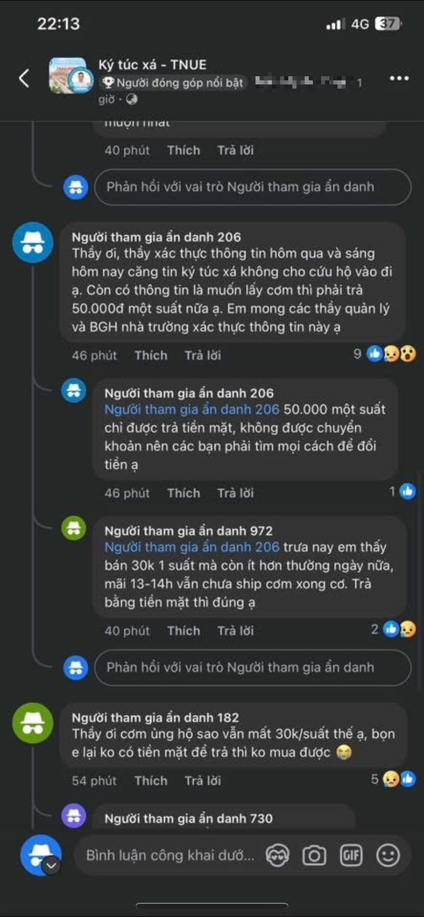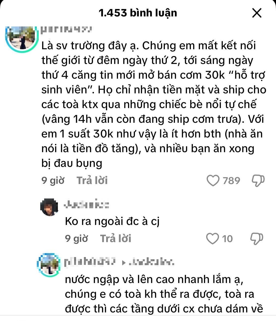 Có tài khoản cũng cho biết, căng tin của trường cũng không cho phép sinh viên thanh toán hình thức chuyển khoản trong những ngày mưa lũ, chỉ nhận tiền mặt khiến nhiều sinh viên không có tiền mua, phải nhịn đói. Nhà trường cũng không có động thái tiếp tế đồ ăn cho các em.
