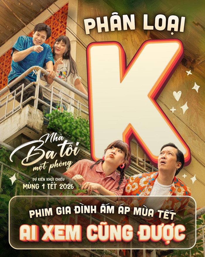 Dự kiến khởi chiếu vào mùng 1 Tết Nguyên đán 2026, Nhà Ba Tôi Một Phòng được xem là lựa chọn an toàn cho các gia đình muốn cùng nhau ra rạp đầu năm. Việc đạt phân loại K không chỉ là lợi thế truyền thông, mà còn cho thấy sự thay đổi trong tư duy làm phim của Trường Giang – chậm rãi hơn, tiết chế hơn và hướng nhiều hơn đến giá trị lâu dài.