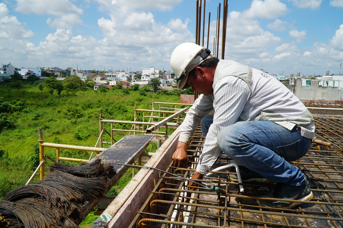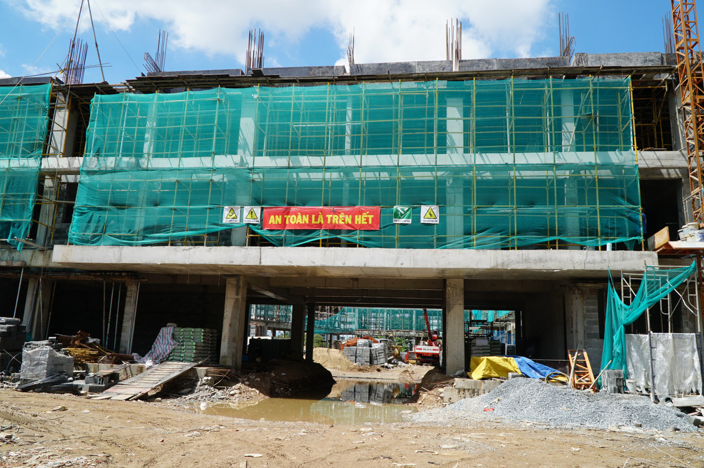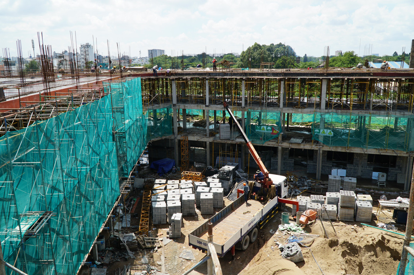 Đến nay, phần thô của trường đã hoàn thiện, các hạng mục đang được gấp rút thi công. Hàng chục công nhân đội nắng, mưa tất bật với công việc cho kịp tiến độ.