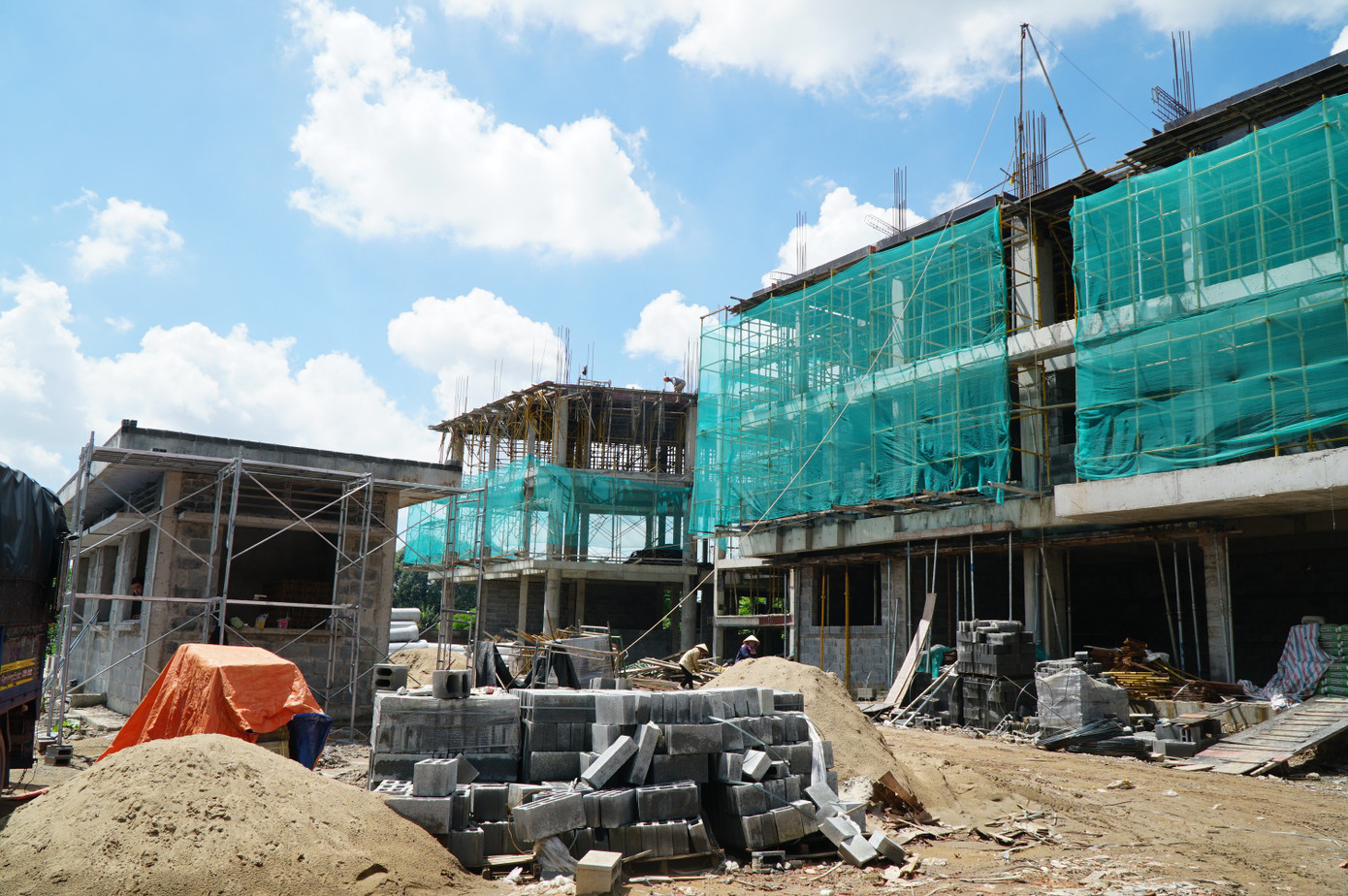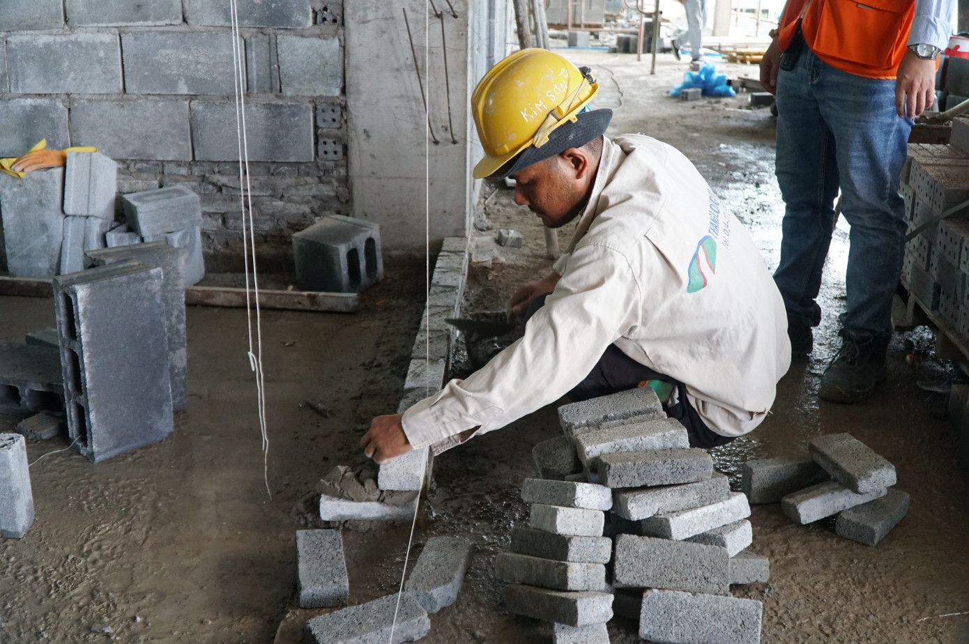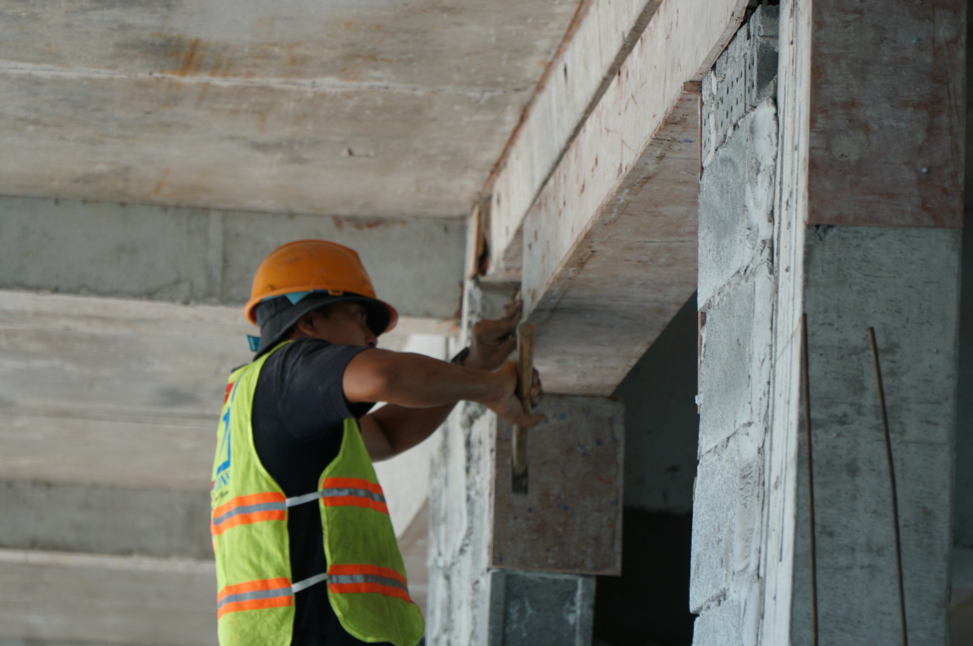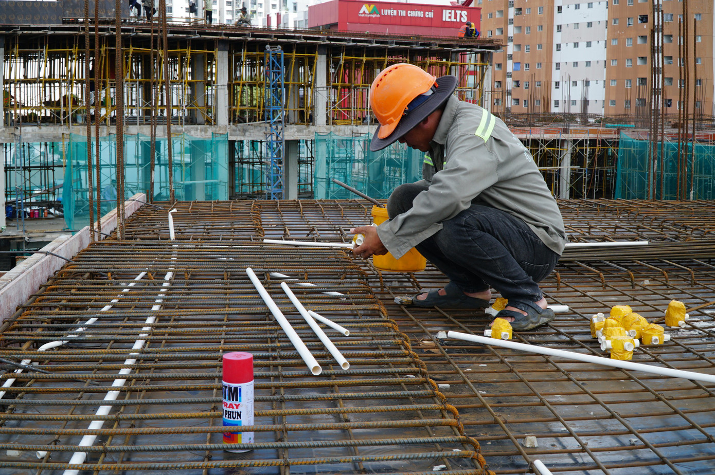 Đến nay, phần thô của trường đã hoàn thiện, các hạng mục đang được gấp rút thi công. Hàng chục công nhân đội nắng, mưa tất bật với công việc cho kịp tiến độ.