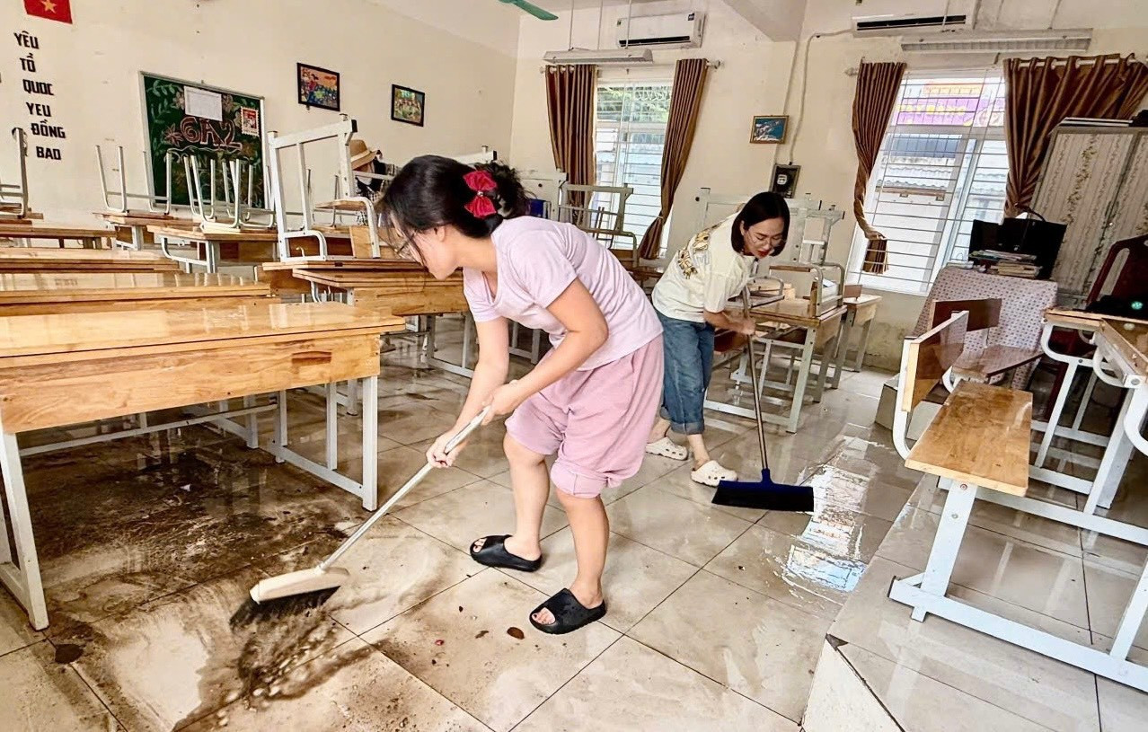 Giáo viên trường học tại Hà Nội dọn dẹp trường lớp bị mưa ngập do ảnh hưởng bão số 11 để chuẩn bị đón học sinh quay lại trường học.