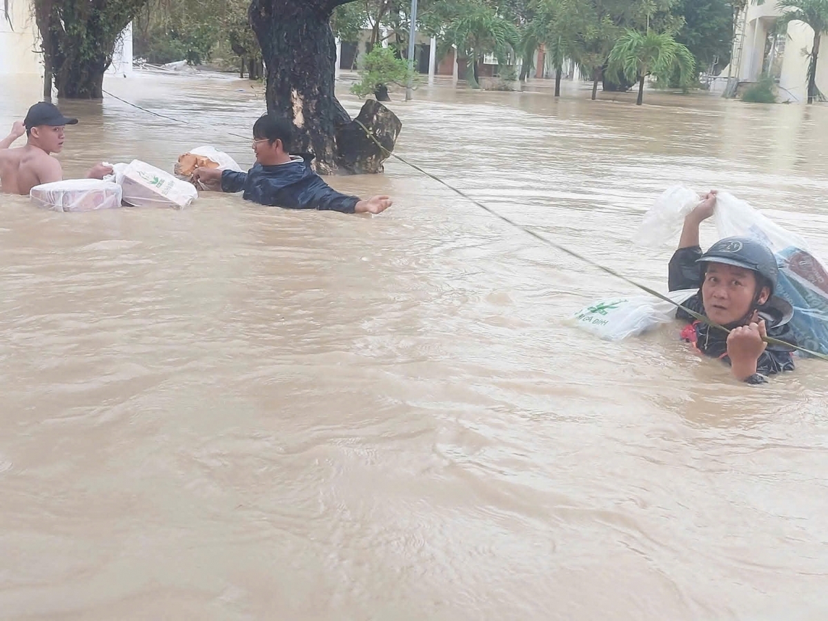 Đêm 18/11, lũ lên nhanh tại các địa bàn phường Quy Nhơn Bắc (Gia Lai). Thầy Phạm Minh Tường, Hiệu trưởng Trường Cao đẳng Kỹ thuật Công nghệ Quy Nhơn cho biết, dù nền trường có kết cấu cao trên 1.5m nhưng nước vẫn tràn vào sàn nhà. Nước dâng cao tới ngực, cằm, có đoạn cao vượt đầu người lớn.