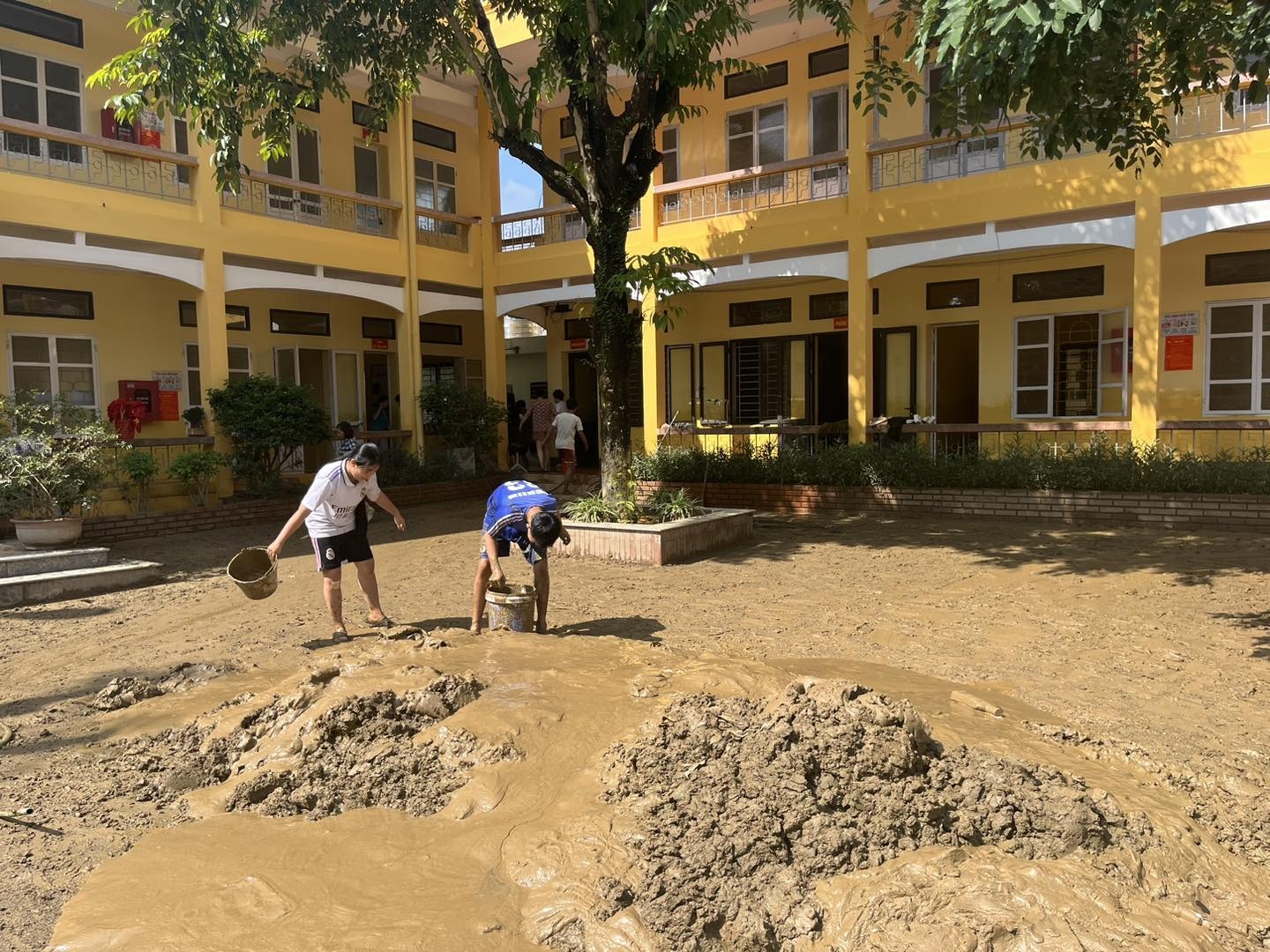 Ngay khi nước rút, thầy cô nhà trường cùng lực lượng hỗ trợ đã nhanh chóng khắc phục hậu quả sau lũ, dọn dẹp, sửa chữa trường học để học sinh sớm trở lại học tập. Ảnh: FBNT.