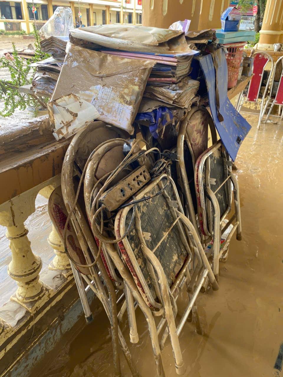 Cũng ở Tuyên Quang, tại trường THCS Quang Trung (phường Hà Giang 2), nước lũ tràn vào làm hư hỏng nhiều bàn ghế, sách vở, tài liệu và nhiều trang thiết bị dạy học. Phòng học ngập trong bùn đất, mọi đồ dùng sinh hoạt, học tập đều bị ảnh hưởng nghiêm trọng. Ảnh: FBNT.