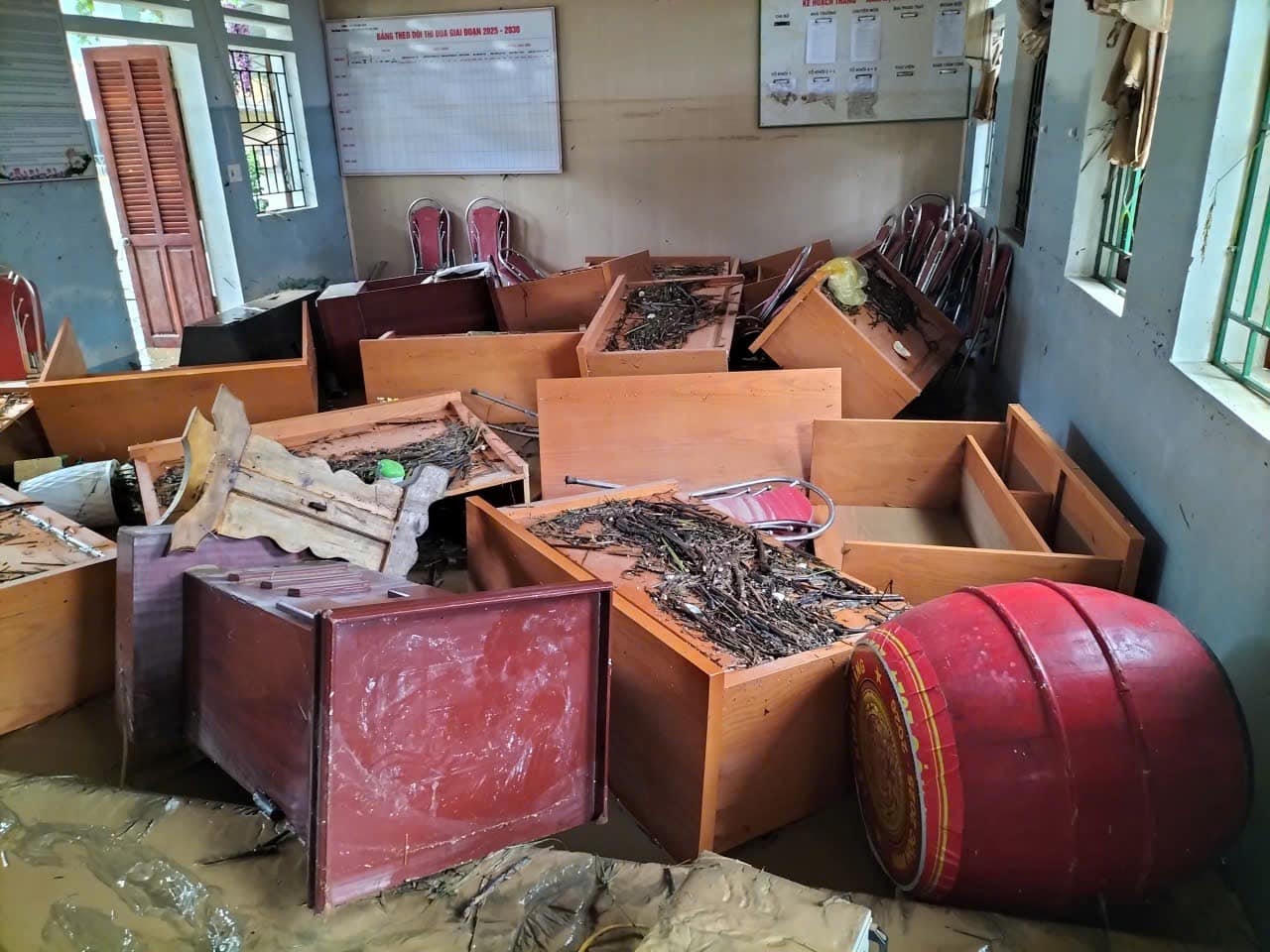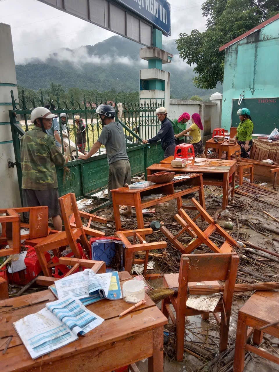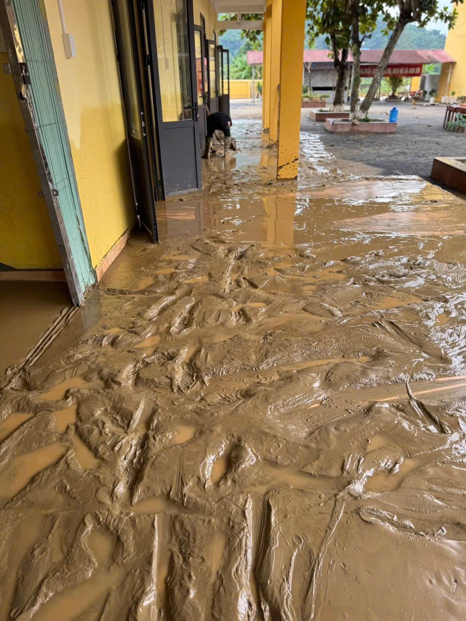Nước sông lên nhanh kéo theo lượng bùn đất khổng lồ phủ kín toàn bộ bề mặt lớp học và sân trường. Nhà trường chỉ kịp đưa hơn 200 học sinh nội trú về nhà tránh lũ. Sách giáo khoa, vở viết, thiết bị đồ dùng, trang thiết bị dạy học, cơ sở vật chất như tivi, bàn ghế, bảng, bếp ăn, giường ngủ học sinh… đều bị cuốn trôi và hư hỏng. May mắn không có thiệt hại về người. Ảnh: FBNT.