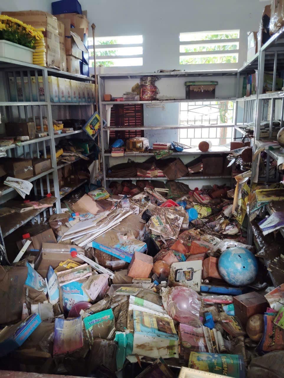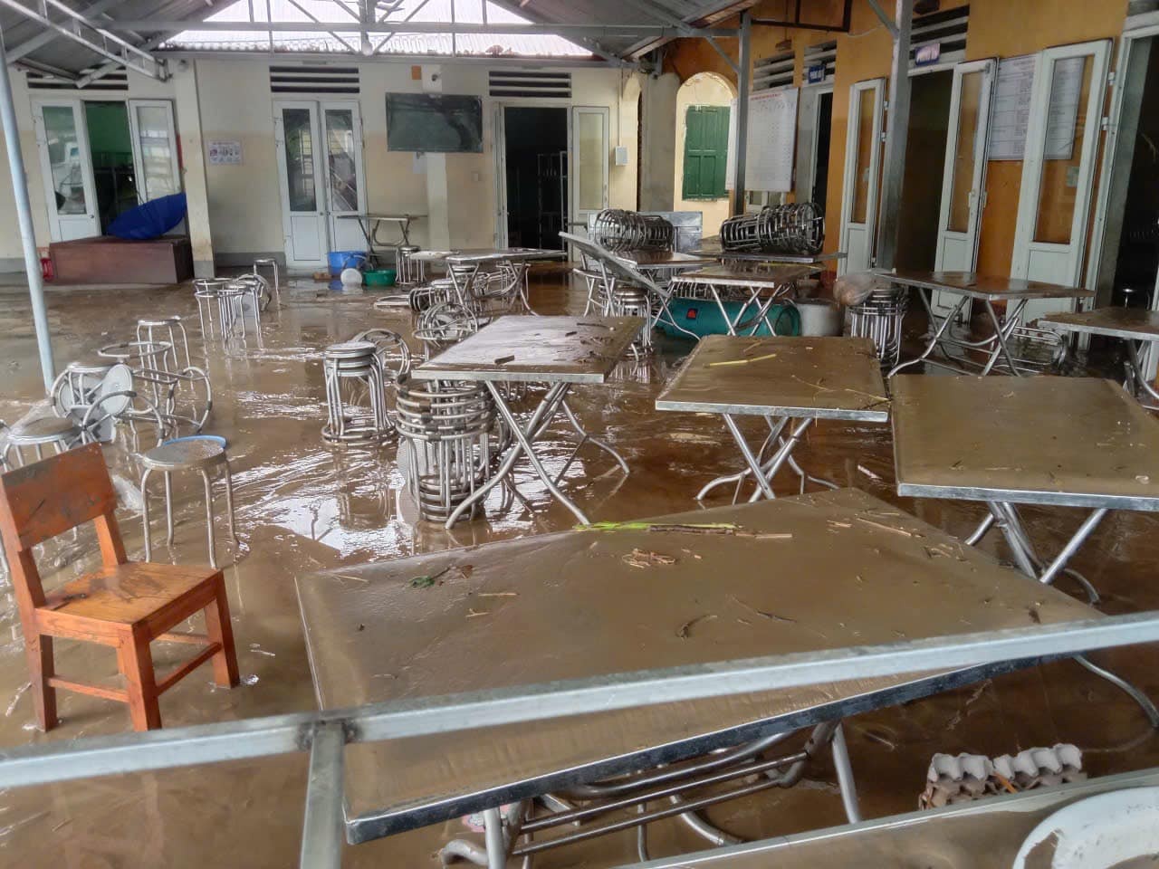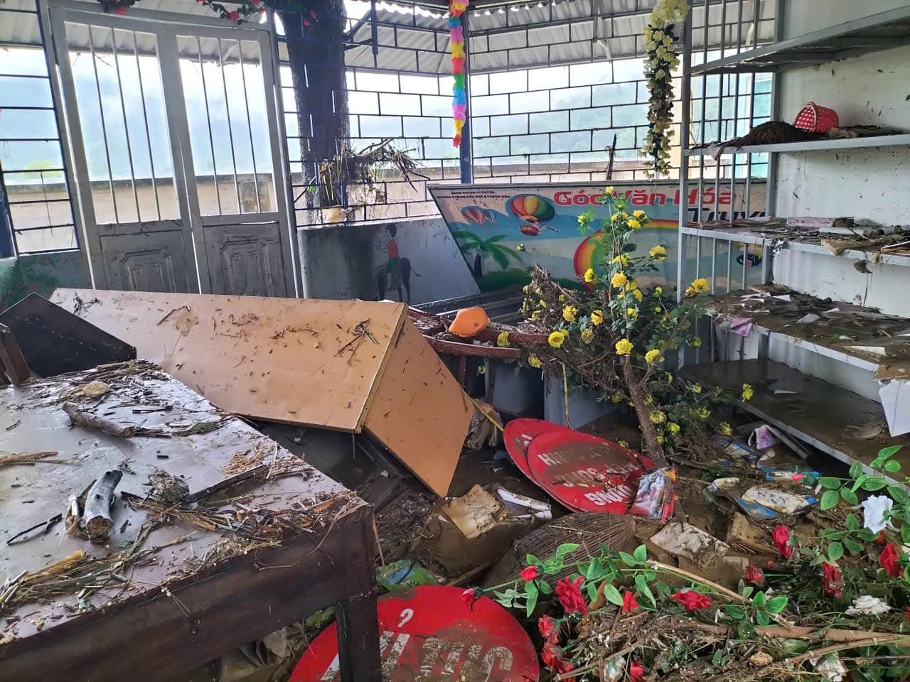 Nước sông lên nhanh kéo theo lượng bùn đất khổng lồ phủ kín toàn bộ bề mặt lớp học và sân trường. Nhà trường chỉ kịp đưa hơn 200 học sinh nội trú về nhà tránh lũ. Sách giáo khoa, vở viết, thiết bị đồ dùng, trang thiết bị dạy học, cơ sở vật chất như tivi, bàn ghế, bảng, bếp ăn, giường ngủ học sinh… đều bị cuốn trôi và hư hỏng. May mắn không có thiệt hại về người. Ảnh: FBNT.