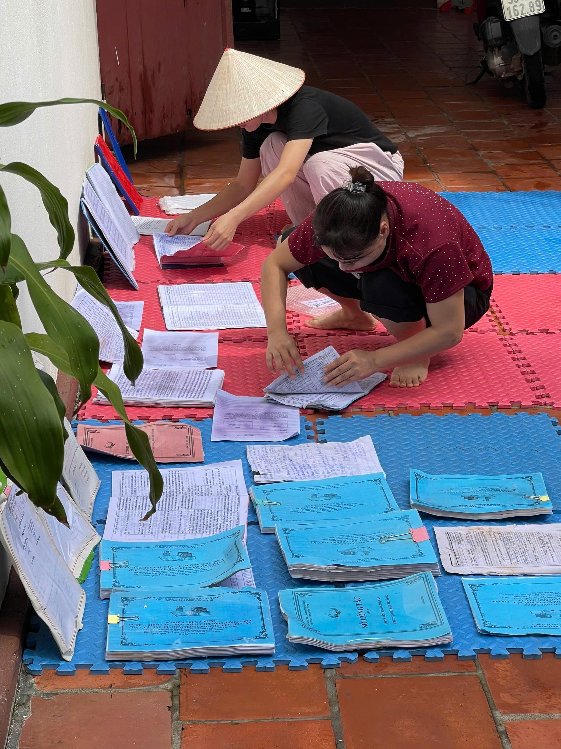 Các cô giáo đang cố lật lại những tài liệu còn có thể tái sử dụng được sau di chuyển khỏi trận lũ vừa rồi