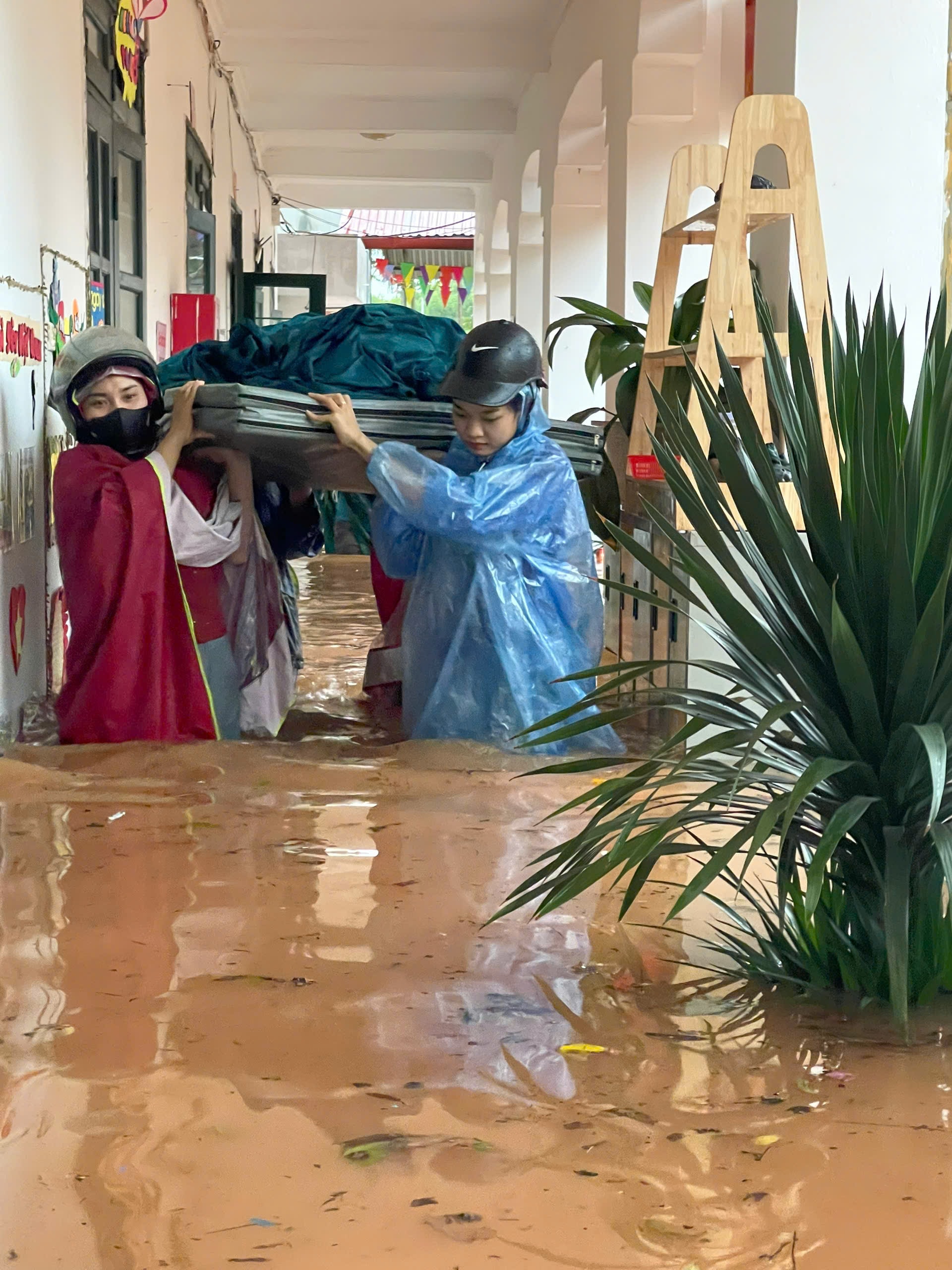 Các cô giáo đang vận chuyển các thiết bị điện tử tránh khỏi những vùng ngập nặng - Ảnh: NVCC