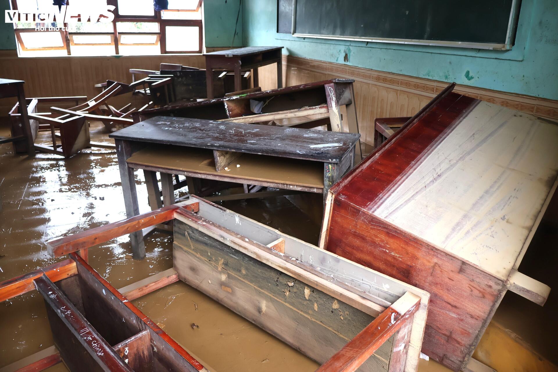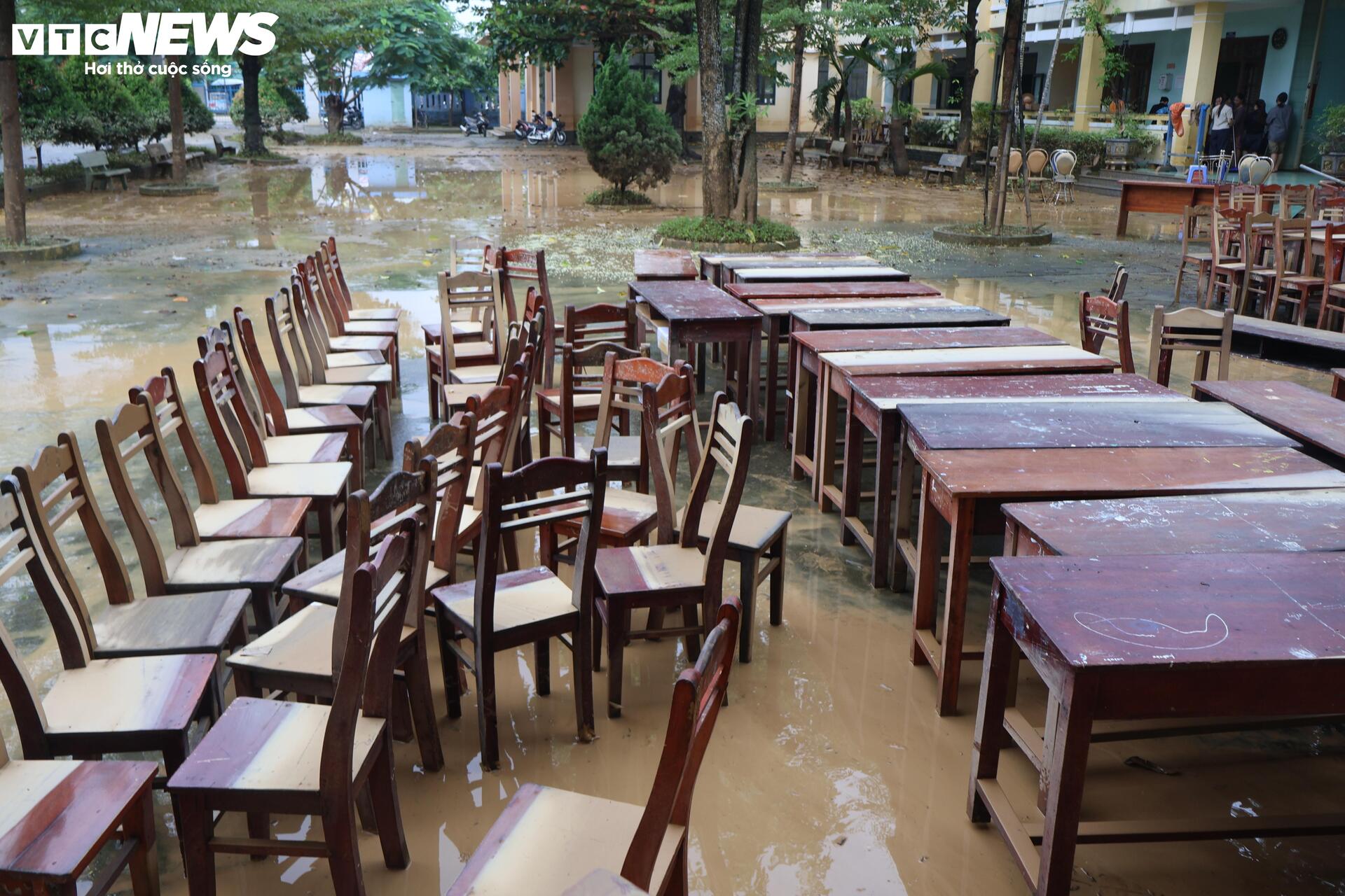 Trong đợt lũ lịch sử vừa qua, ngôi trường nằm ở khu vực thấp trũng này ngập sâu hơn 2m. Dù các giáo viên đã cố gắng kê cao đồ đạc hết mức có thể, song lũ lớn quá nhanh đã khiến nhiều tài sản bị ngâm trong nước.