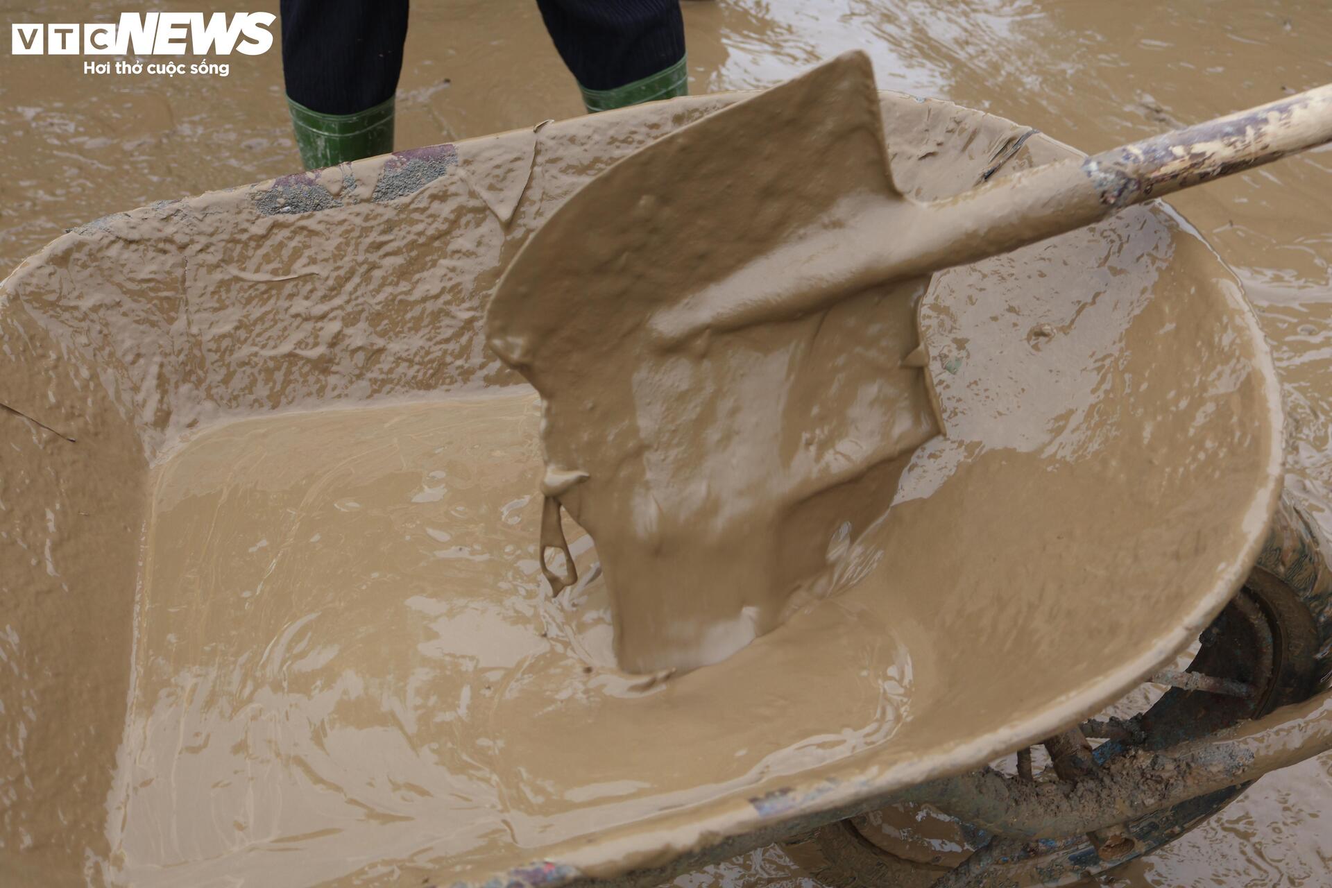 Vì khối bùn non đóng dày đặc nên các cô giáo phải dùng xẻng gạt bớt cho vào xe rùa.