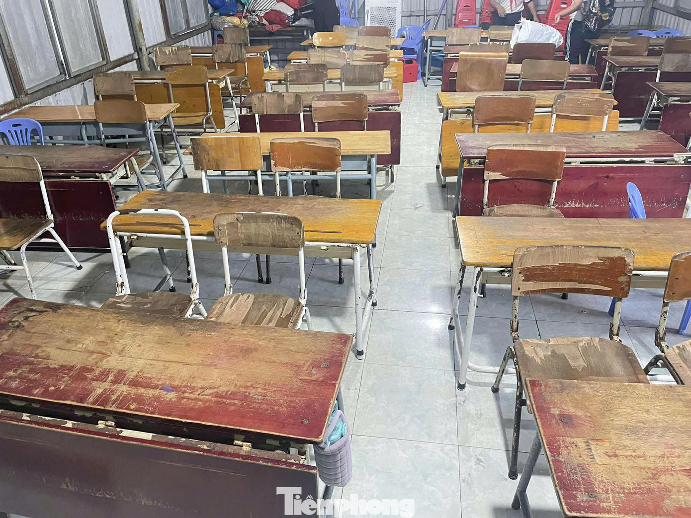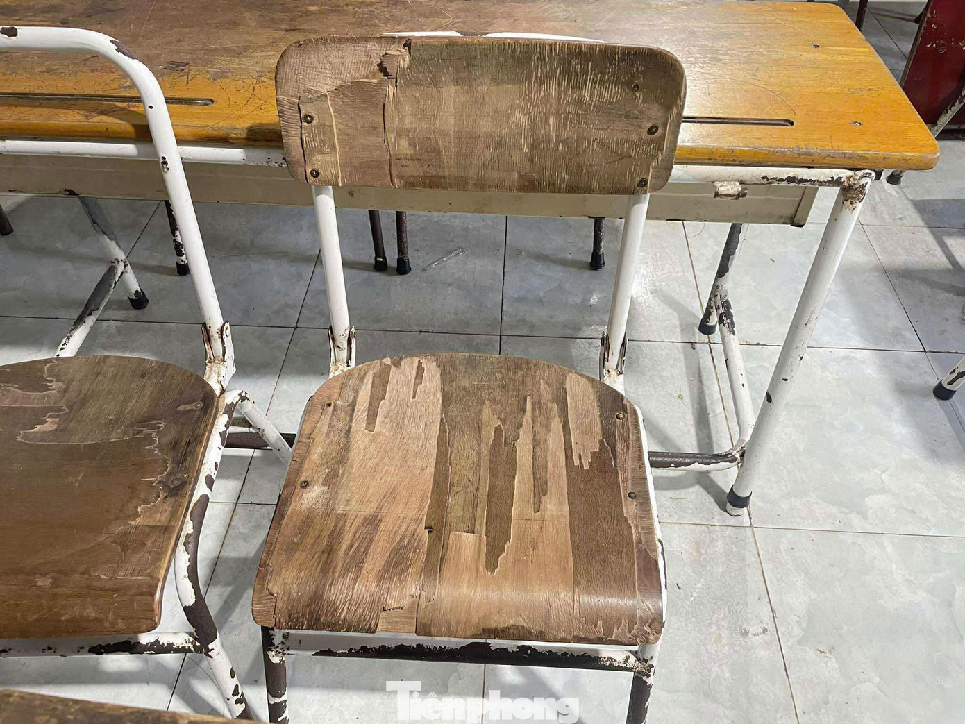 Trong các phòng học dựng tạm bằng tôn, bàn ghế học sinh đã xuống cấp, hư hỏng