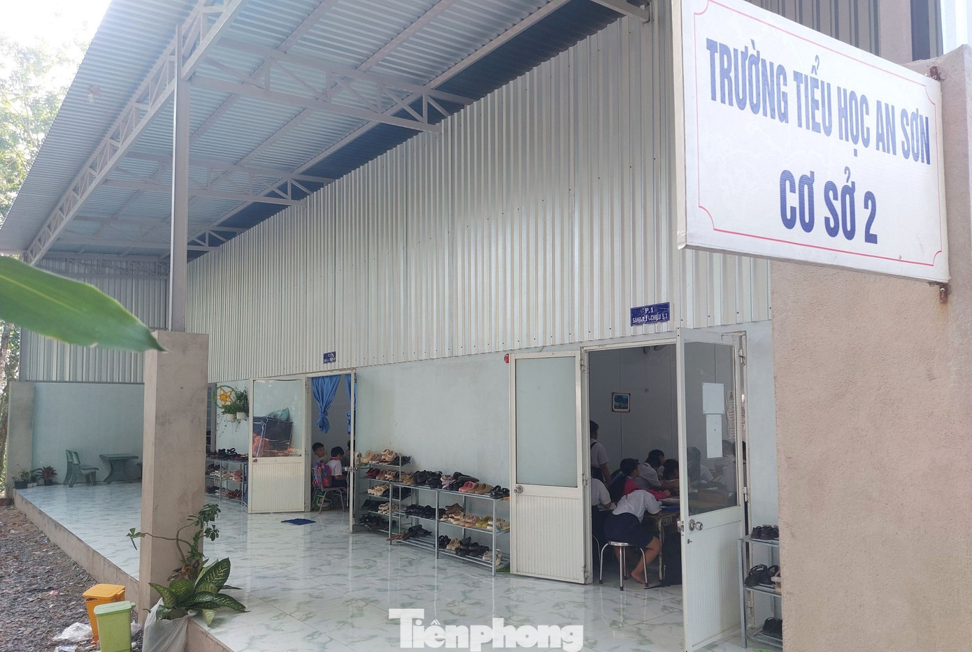 Nằm bên đường liên tỉnh ĐT.748, Trường Tiểu học An Sơn chỉ có duy nhất một dãy nhà trệt, rất cũ, bố trí lớp học cho học sinh từ lớp 1 đến lớp 5. Trong khuôn viên chật hẹp của trường dựng tạm 3 phòng học bằng tôn đơn sơ.