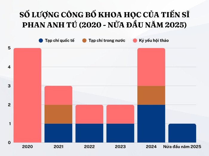 Số lượng công bố khoa học của Tiến sĩ Phan Anh Tú trong giai đoạn từ năm 2020 đến nửa đầu năm 2025. Thiết kế: Gia Hân.
