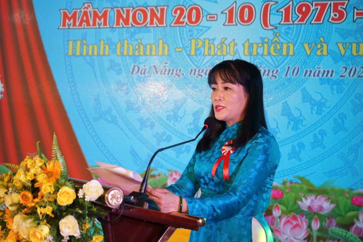 Phát biểu tại buổi lễ, cô Trần Thị Hà Thanh - Hiệu trưởng Trường Mầm non 20-10, xúc động ôn lại hành trình nửa thế kỷ hình thành và phát triển của ngôi trường. Trường được thành lập ngày 20-10-1975, đúng dịp kỷ niệm Ngày Phụ nữ Việt Nam, là cơ sở nuôi dạy trẻ đầu tiên của TP Đà Nẵng, do Hội Liên hiệp Phụ nữ tỉnh Quảng Nam – Đà Nẵng (cũ) sáng lập với mong muốn xây dựng “nơi gửi gắm những mầm xanh” cho con em cán bộ sau ngày thành phố hoàn toàn giải phóng.