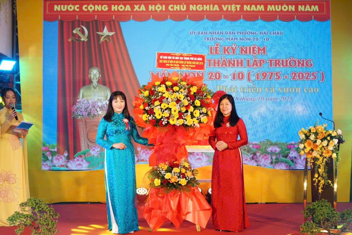 Giám đốc Sở GD&ĐT TP Đà Nẵng Lê Thị Bích Thuận tặng hoa chúc mừng Lễ kỷ niệm 50 năm thành lập Trường Mầm non 20-10