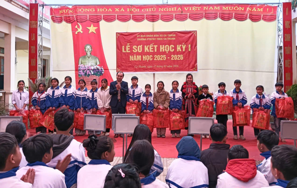 Trường Phổ thông Dân tộc bán trú THCS Ca Thành trao quà tết cho học sinh có hoàn cảnh khó khăn.